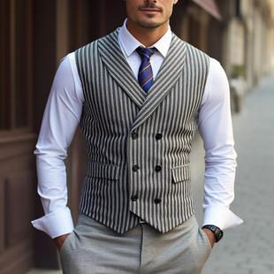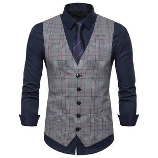 有水洗标外贸马甲英伦修身男士双排扣格子西装马甲商务休闲背心潮