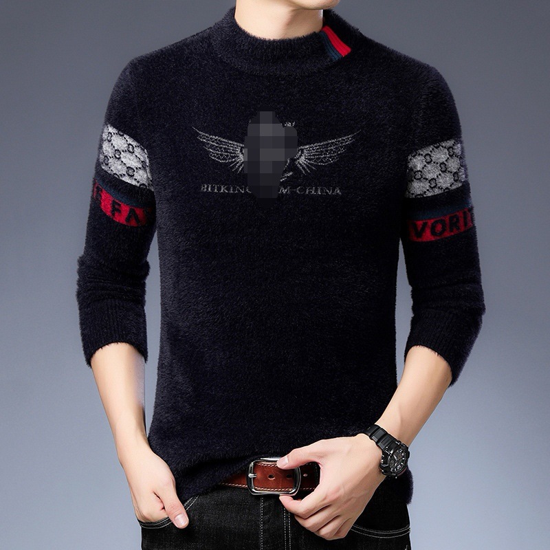 仿貂绒毛衣男加绒加厚款冬季印花半高领中年男士羊毛打底衫男代发