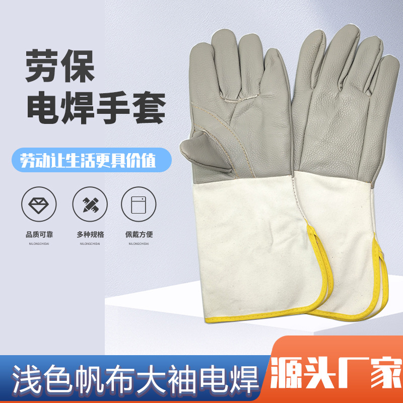 계층화 된 1 층 소 가죽 밝은 색상의 캔버스 소매, 큰 입 강화 용접 장갑, 용접기 용 보호 가죽 장갑