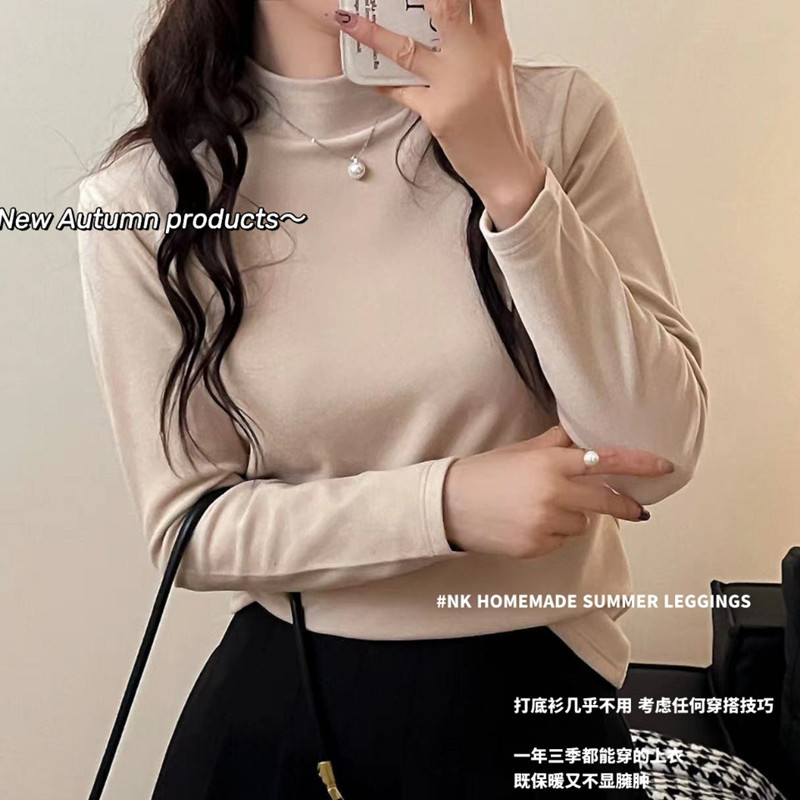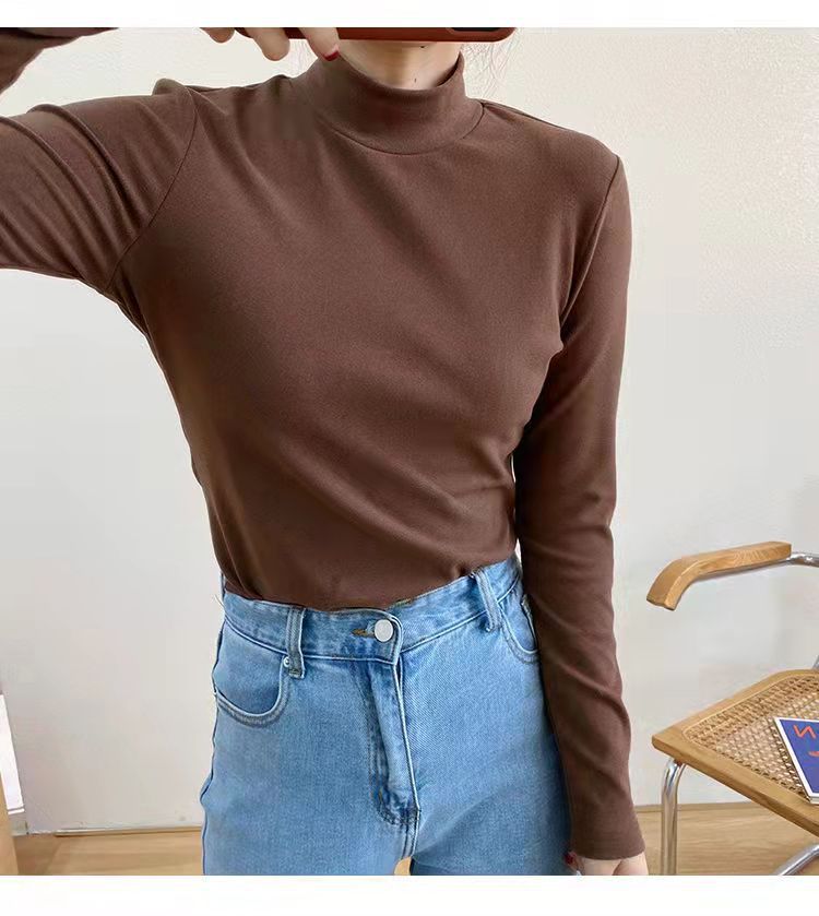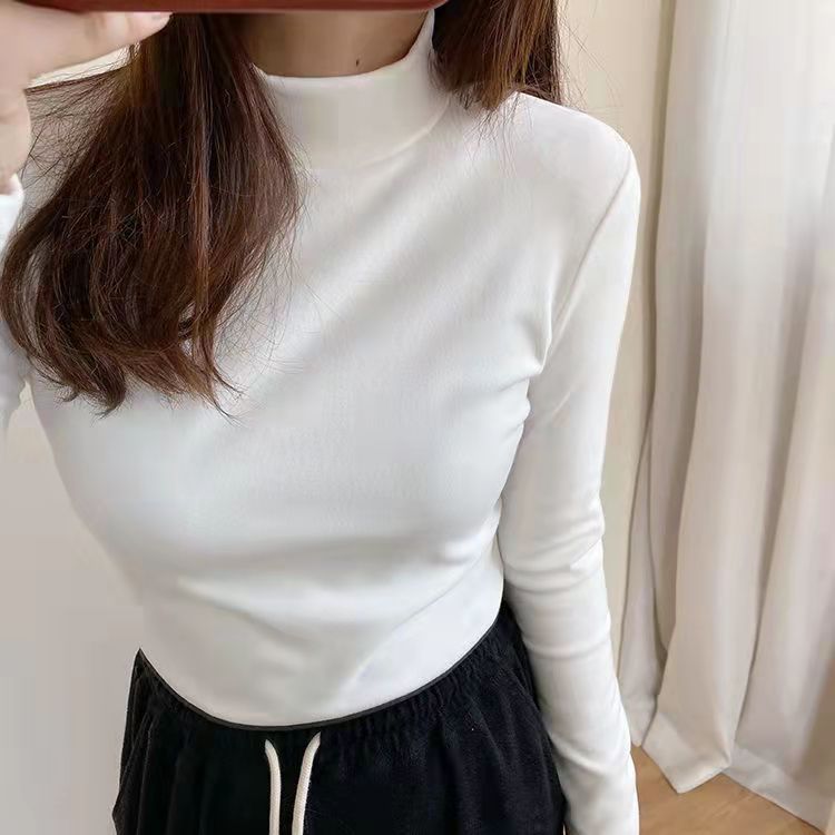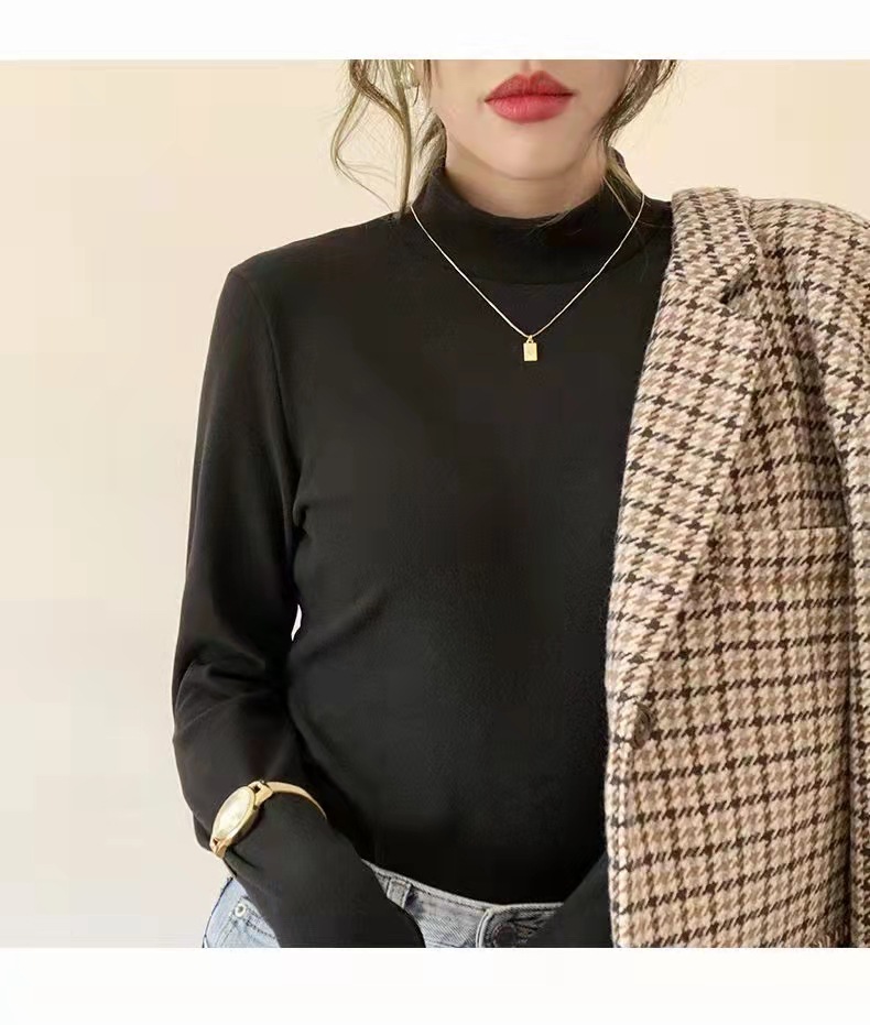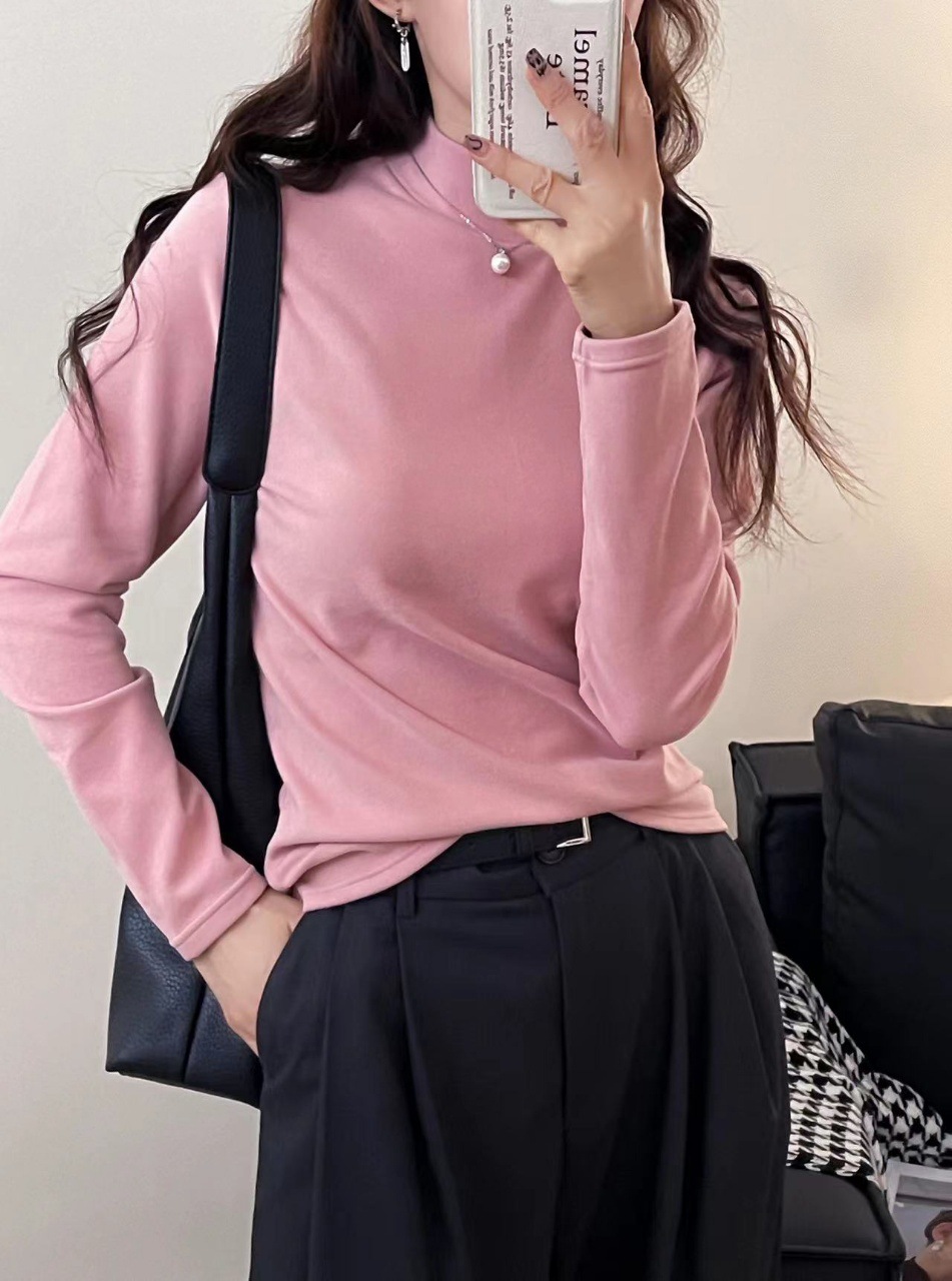 가을과 겨울을위한 여성용 미드 칼라베이스 셔츠 따뜻한 내부 기모 두꺼운 반 높이 칼라 양면 브러시 양이온 탑스토어 가기