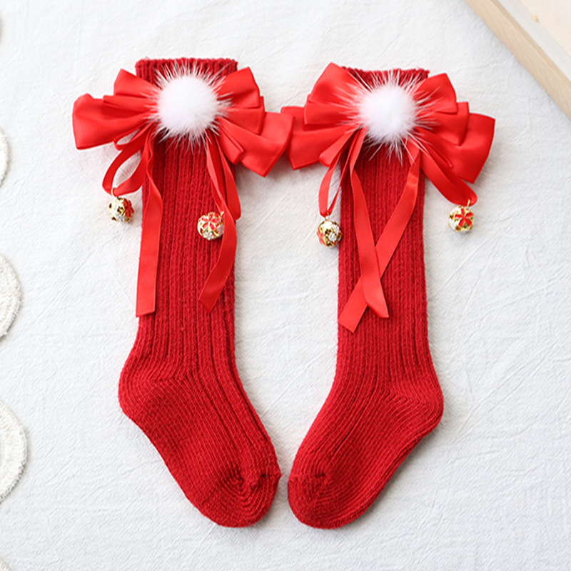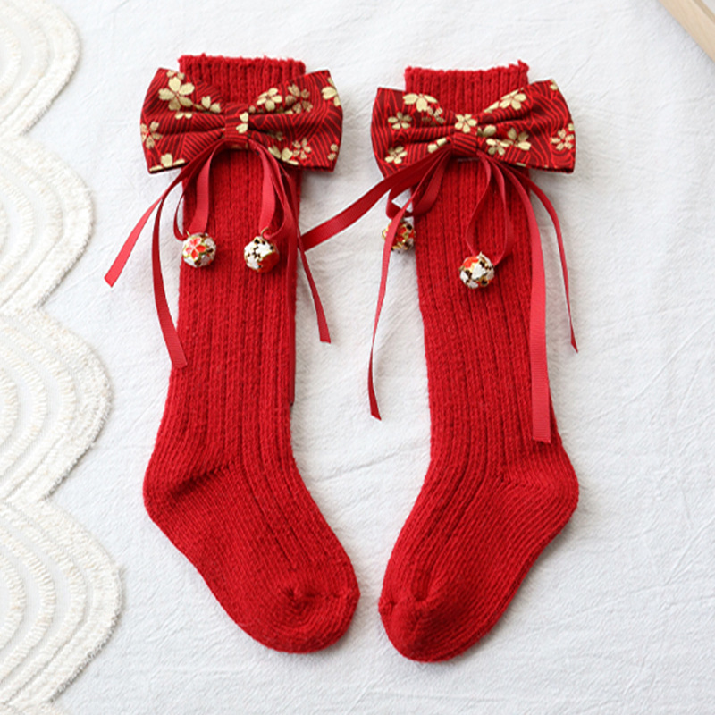 가을과 겨울 두꺼운 아기 빨간 양말 신생아 백일 오래된 어린이 새해 국가 스타일 벨 보우 아기 양말