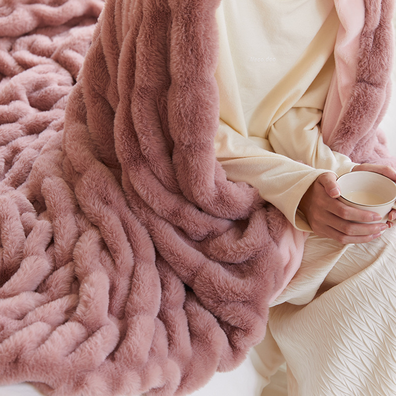 柔软的大兔毛绒面料,冬天盖在身上,搭在腿上加倍温暖。各种场合都可以完美搭配您的家居生活。适合样板间装饰,卧室盖毯,沙发盖毯,做工居家出行,四季可用。