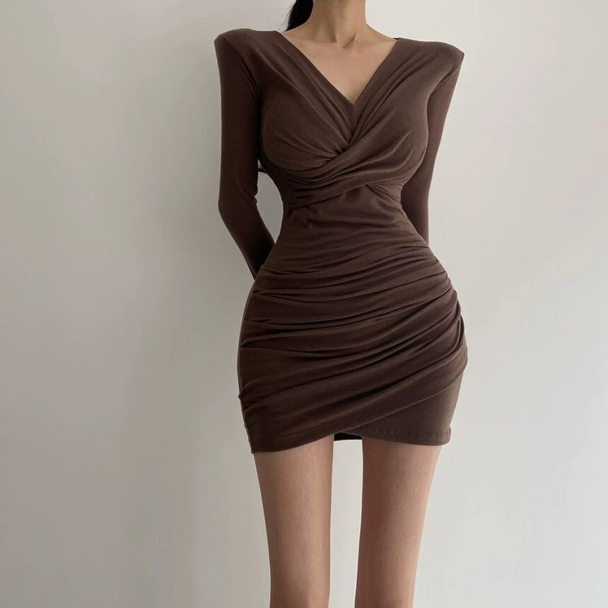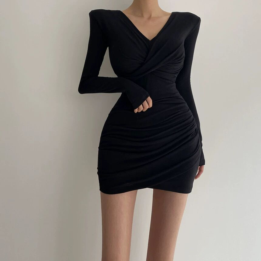 한국판 동대문 가을 겨울 여성용 슬림핏 섹시 브이넥 긴팔 주름 원피스 바디콘 스커트