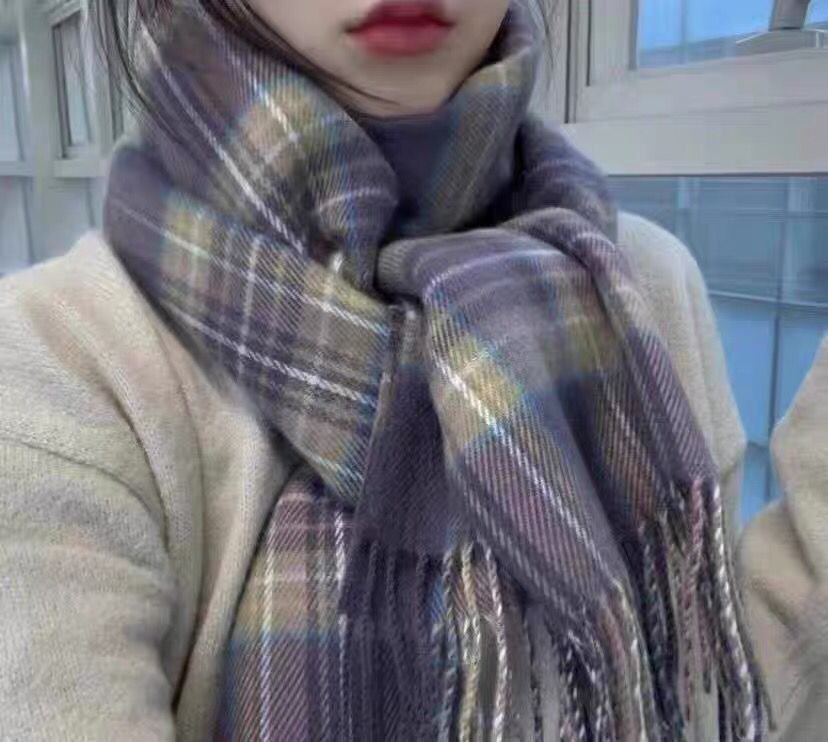 부드러운 포도 보라색 격자 무늬 스카프 여성의 겨울 복고풍 따뜻한 술 스카프 한국 2023 새로운 두꺼운 스카프스토어 가기