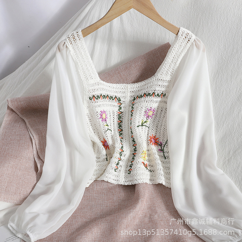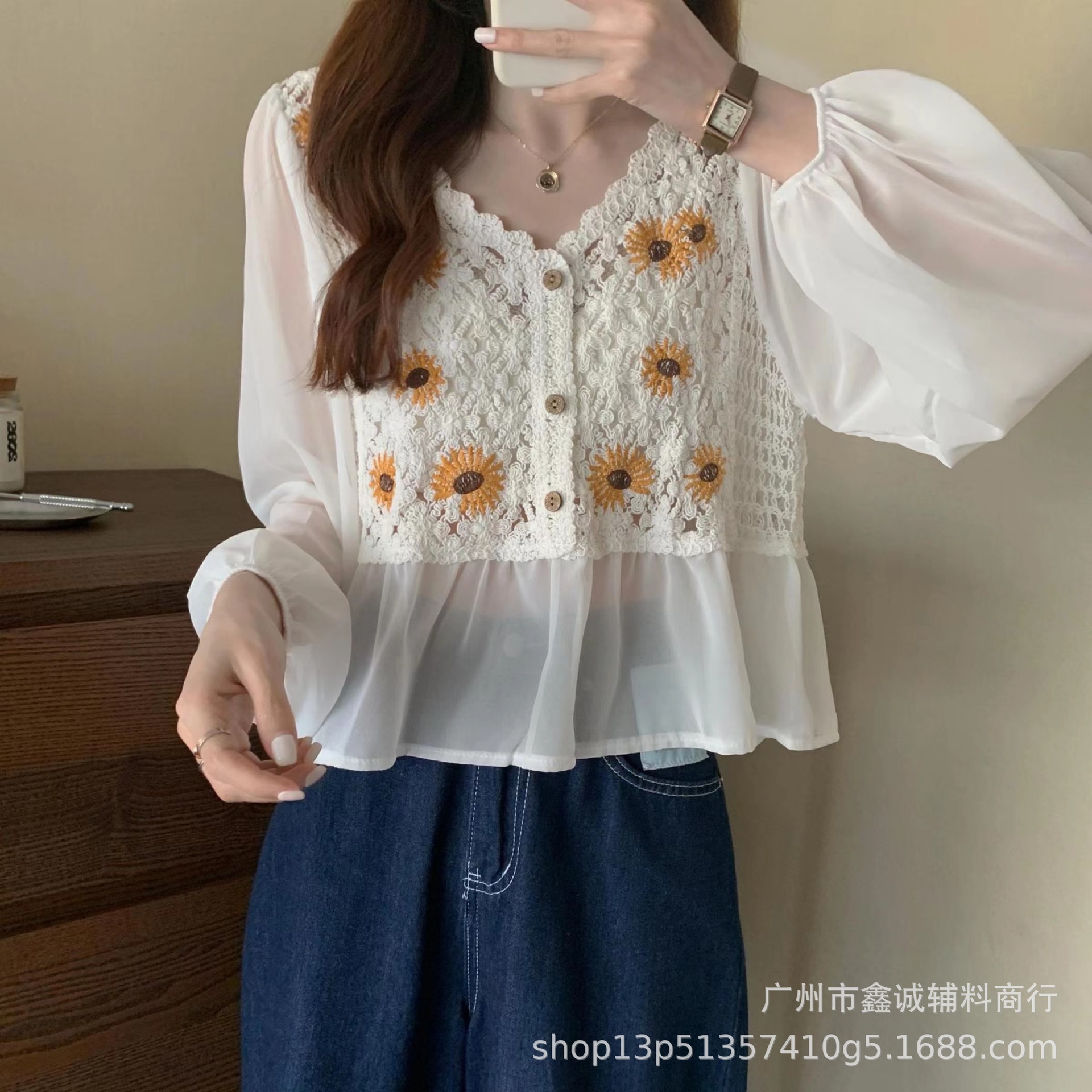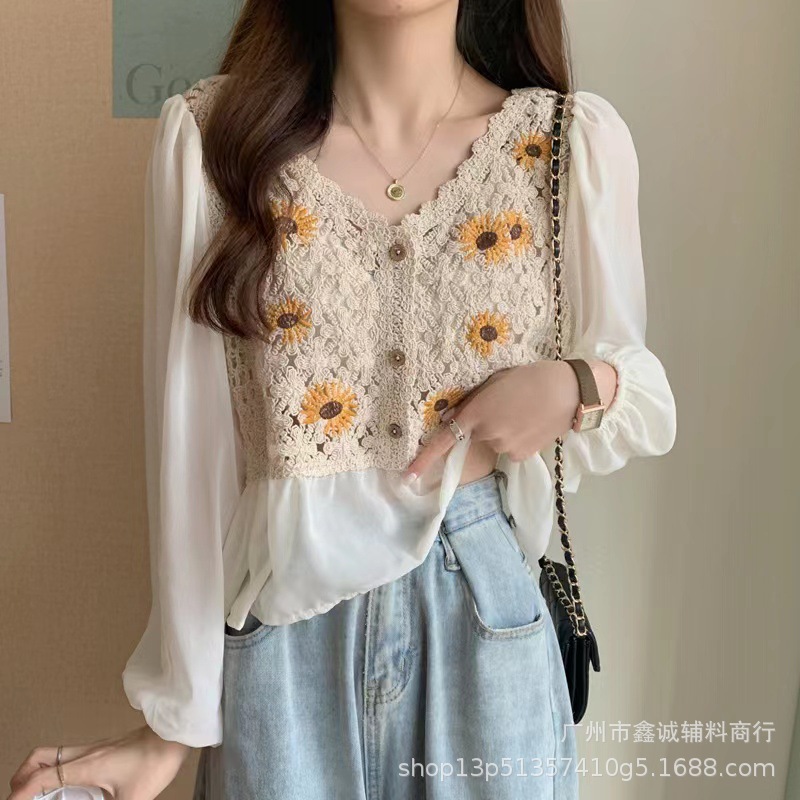 새로운 프랑스 스타일 꽃 자수 셔츠 여성의 유행 우아한 느슨한 디자인 감각 퍼프 슬리브 화이트 셔츠 긴 소매 유행스토어 가기