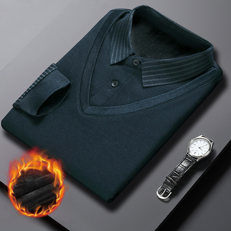 겨울 기모 가짜 투피스 티셔츠 남성용 두꺼운 따뜻한 라펠베이스 티셔츠 젊은 중년 스트라이프 탑