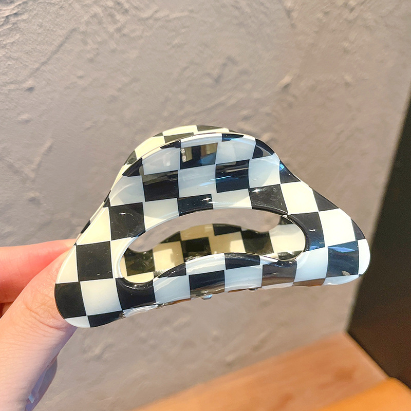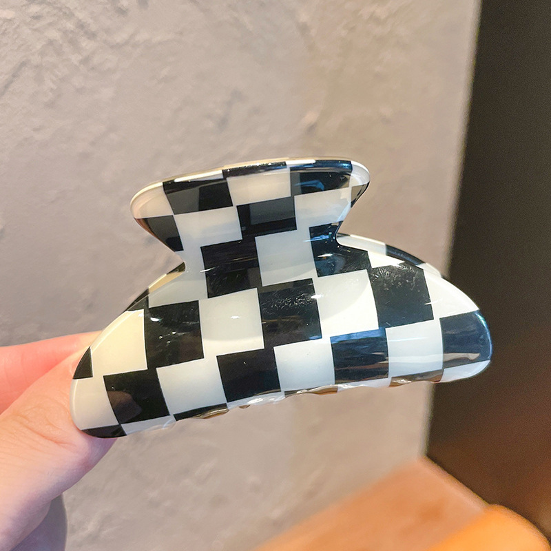 棋盘格抓夹~黑白格子半圆气质大号网红鲨鱼夹ins小众设计发饰发夹 黑白棋盘格子发夹女后脑勺盘发抓夹气质简约鲨鱼夹子韩国发卡头饰
