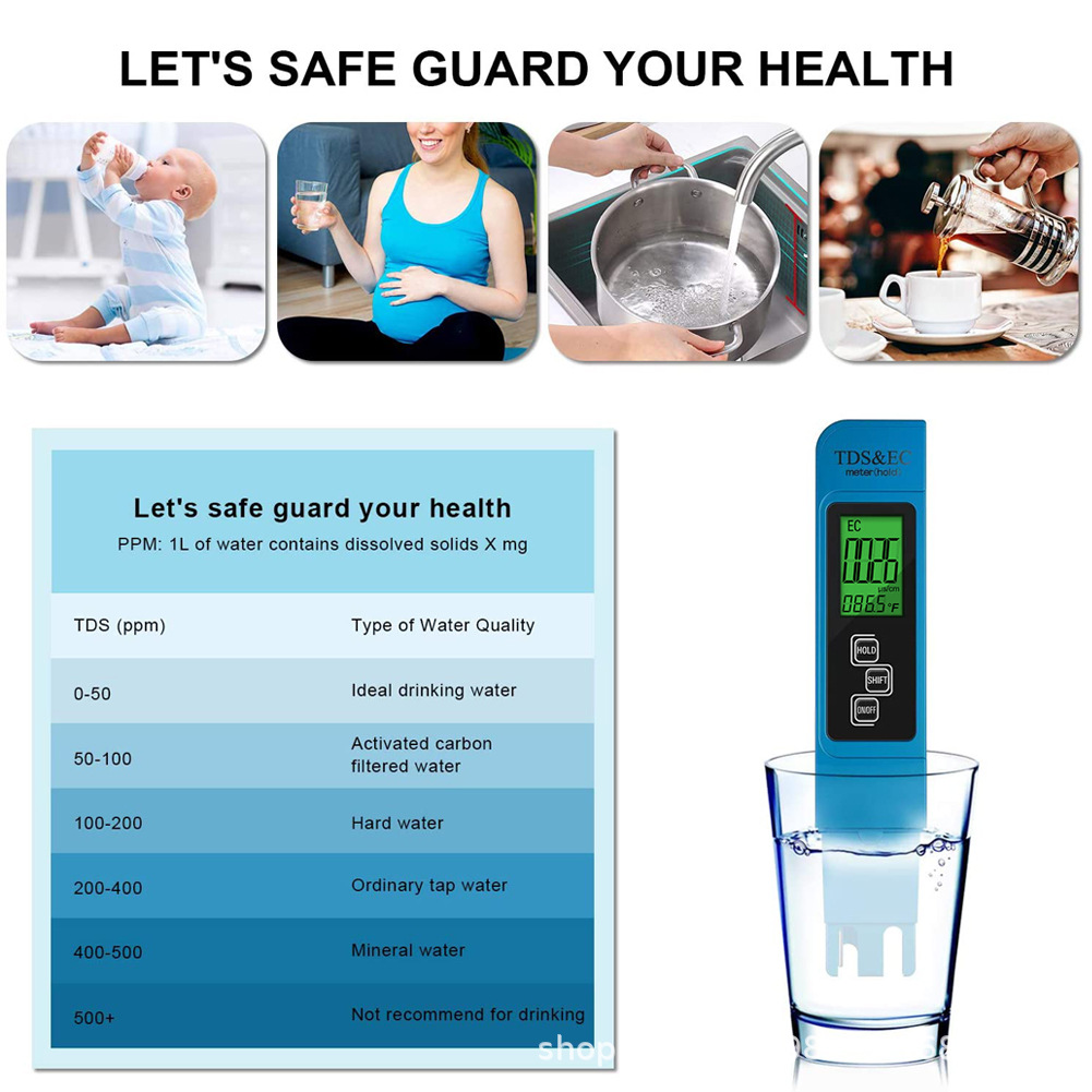 TDS:总溶解固体,它显示了1升水中溶解固体的毫克数。较高的TDS值表明水中溶解的物质较多。使用TDS测量仪可以快速诊断水质,并确保您的水过滤器正常工作