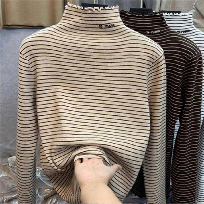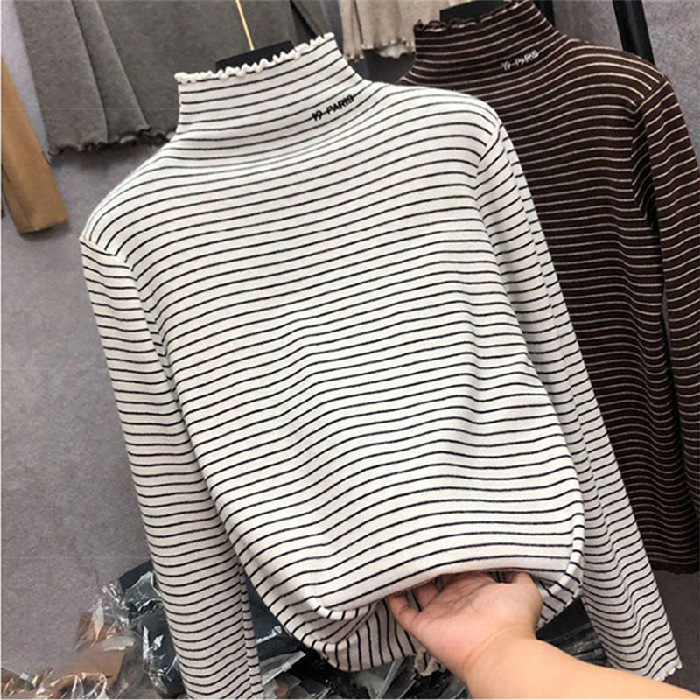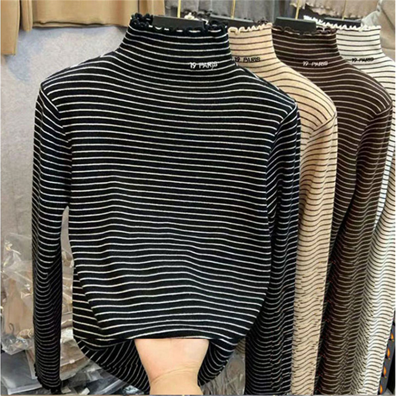 인 슈퍼 핫 하프 하이 칼라 스트라이프 여성용 양털 긴팔 티셔츠 여성용 가을과 겨울 슬림핏 올매치 스타일리시 베이스 셔츠 탑