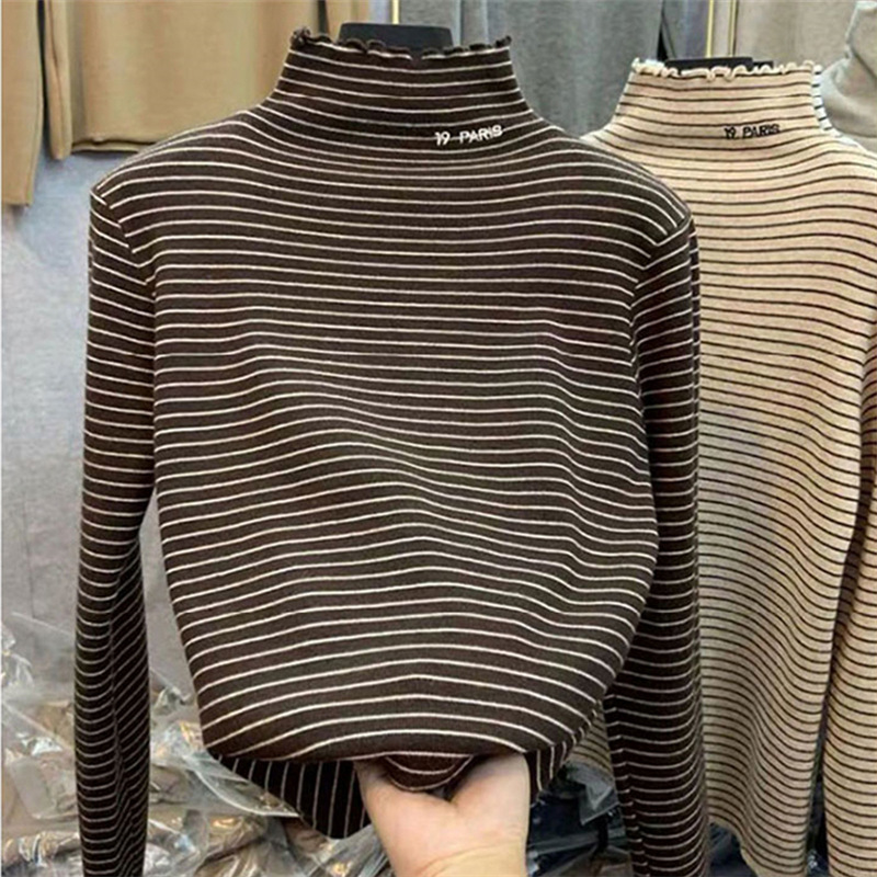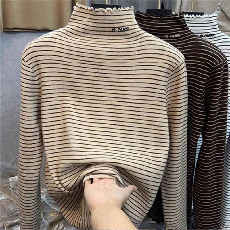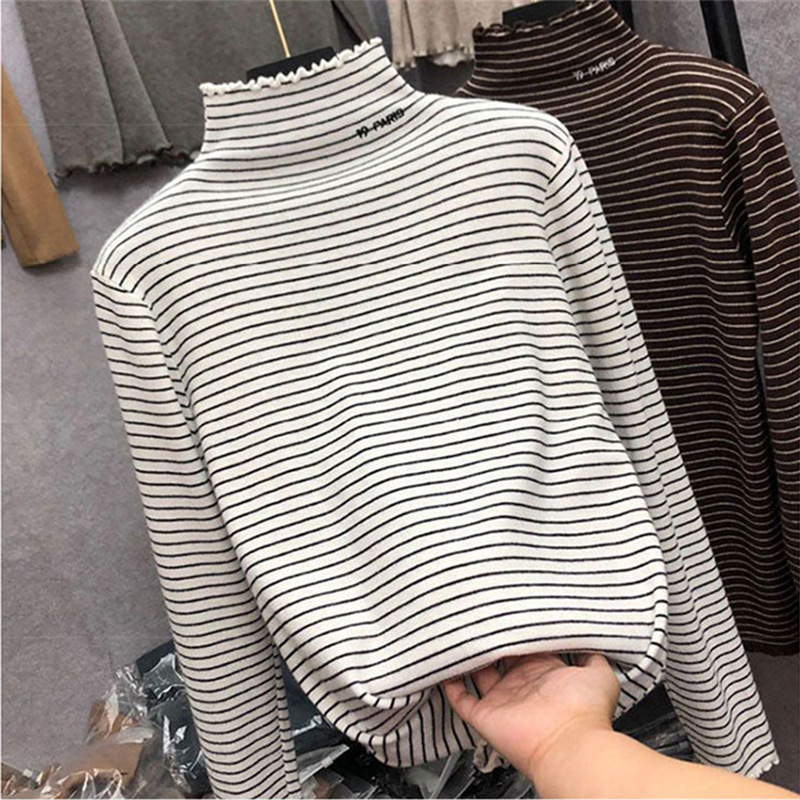 인 슈퍼 핫 하프 하이 칼라 스트라이프 여성용 양털 긴팔 티셔츠 여성용 가을과 겨울 슬림핏 올매치 스타일리시 베이스 셔츠 탑스토어 가기