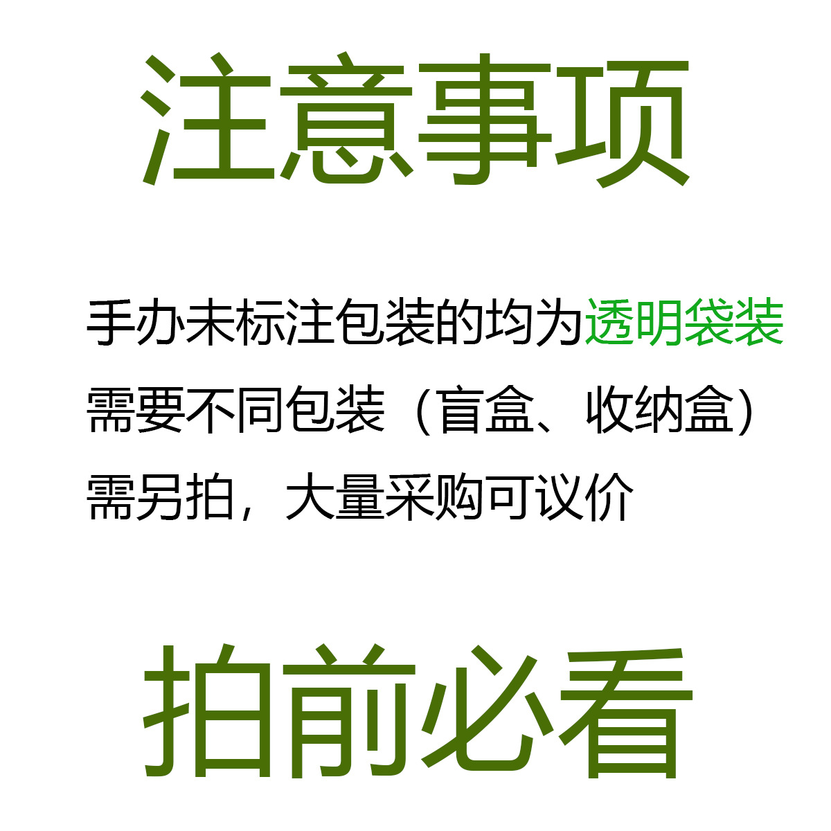 拍前必看:手办默认为透明袋装,需要不同包装组合请另拍,店铺价格不包含税点,玩偶底座配件都是分开,需要收到货自行组装一下(大部分的玩偶摆件都是胶水拼接起来的,在运输中快递暴力扔,压,堆,难免会有出现脱胶的部件掉落,这个都是属于正常的情况,只需胶重新固定一下就可以的,不属于质量问题,如需退货来回运费自理,不接受勿拍,玩偶都是国产的半手工绘制的,会有染色不均、脱色渐染、轻微磨损、掉漆、磨具拼接毛边等,不能接受的完美主义者勿拍,收到货如对商品不满意或质量问题请先联系客服,如需退货请勿拆除外包装(包装为可视化OPP袋,无需拆袋就可看到商品做工,拆袋即接受产品质量),破坏包装(无法二次销售)概不支持退货,有问题请收货后24小时内反馈客服处理,逾期自负,拍下即视为接受上述说明,不接受请勿下单。