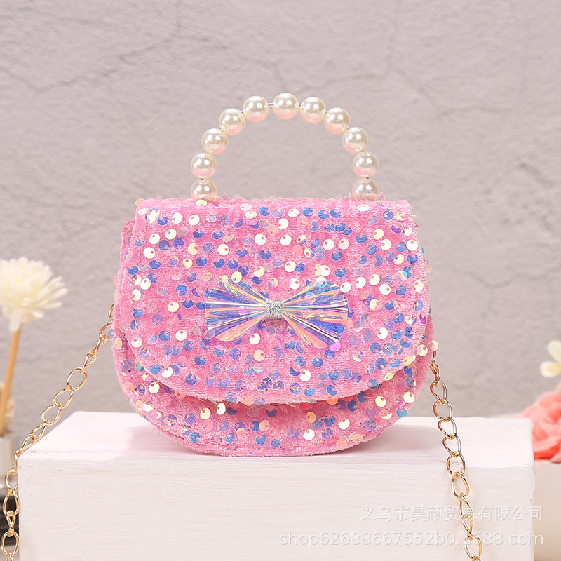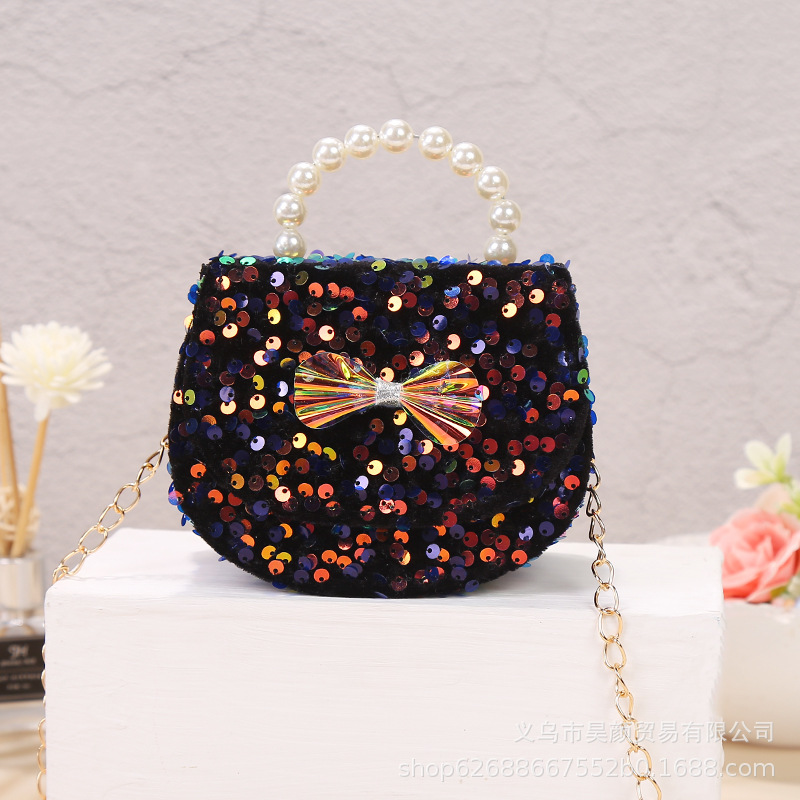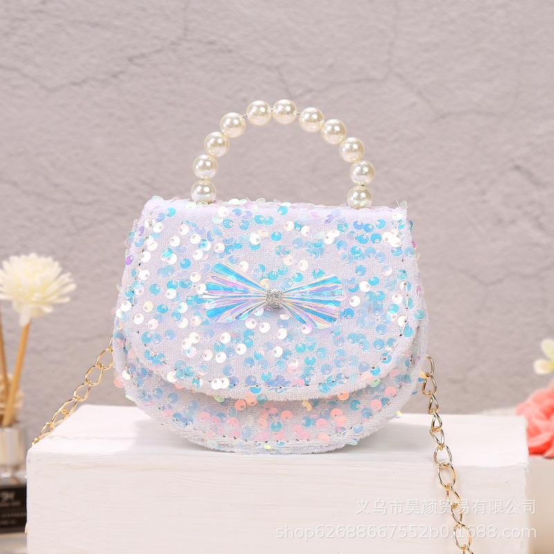 샤넬 스타일 2021 신상품 스팽글 보우 스몰 라운드 백 휴대용 진주 크로스바디 어린이 가방 723