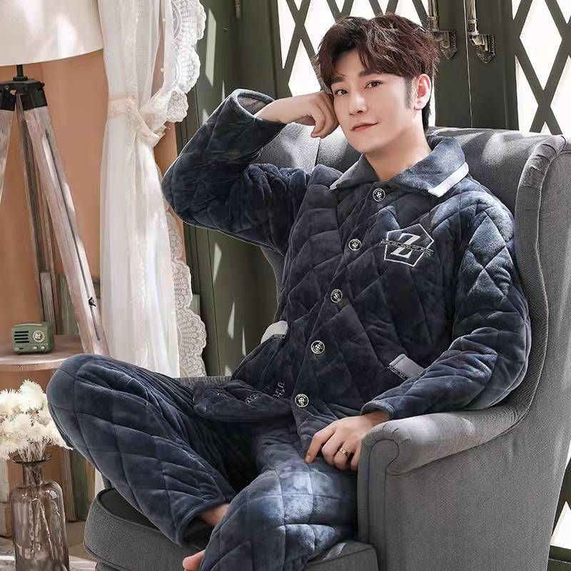 겨울 남성용 3 층 두꺼운 플란넬 퀼트 잠옷 가디건 200 면 패딩 재킷 산호 양털 가정 옷은 외부에서 착용 가능스토어 가기