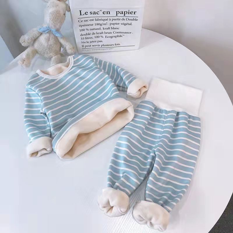 대외 무역 아동 의류 따뜻한 옷 세트 아기 가을과 겨울 높은 허리 어린이 서양식 줄무늬 소년 잠옷 기모 도매