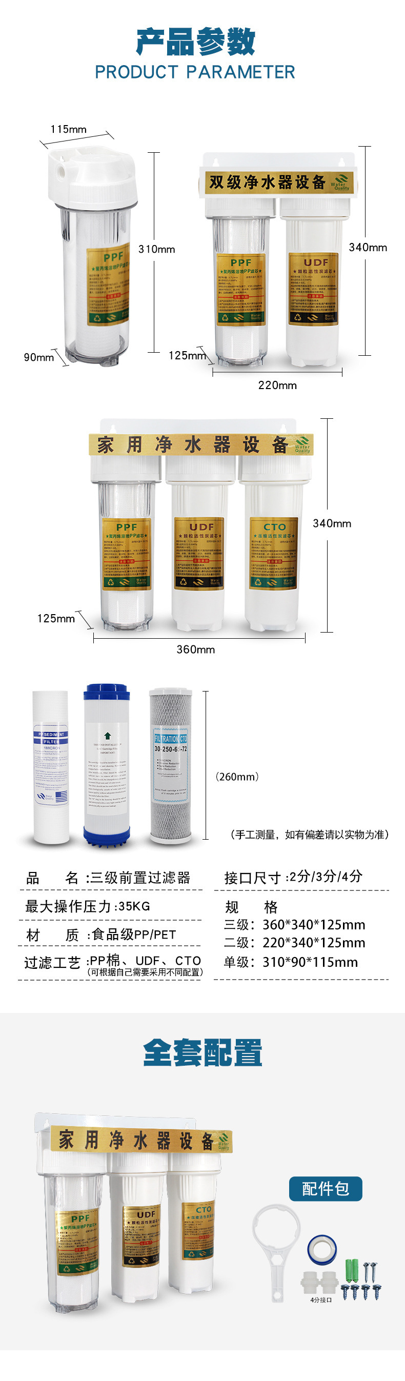 주방 정수기 가정용 10 인치 3 단 사전 필터 탭 정수기 정수기 필터 병 필터 요소