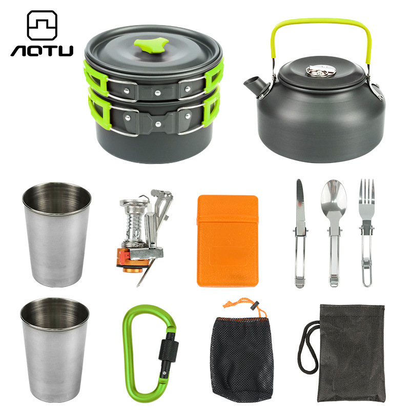 List: big pot * 1, teapot * 1, frying pan * 1, cup * 2, D quick hanging * 1, three piece tableware set * 1, mini stove head * 1
