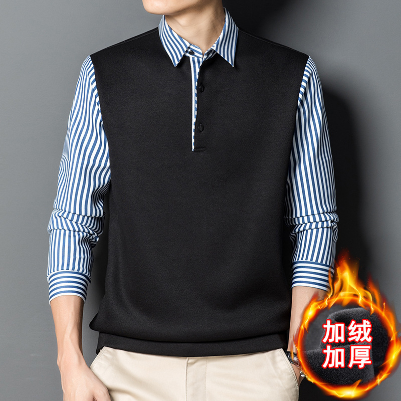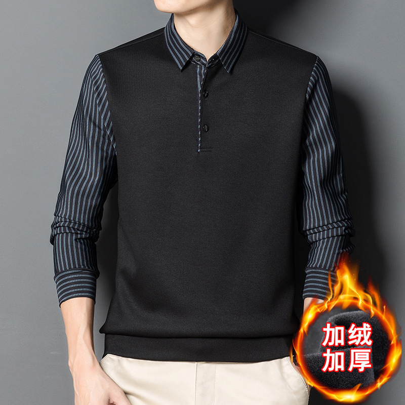 2021秋冬季新款男士加绒假两件条纹袖衬衫长袖中青年T恤男打底衫