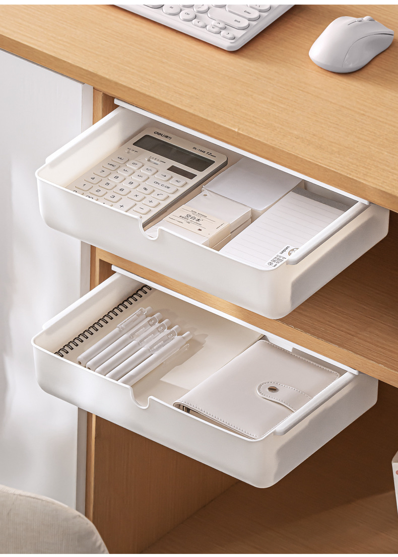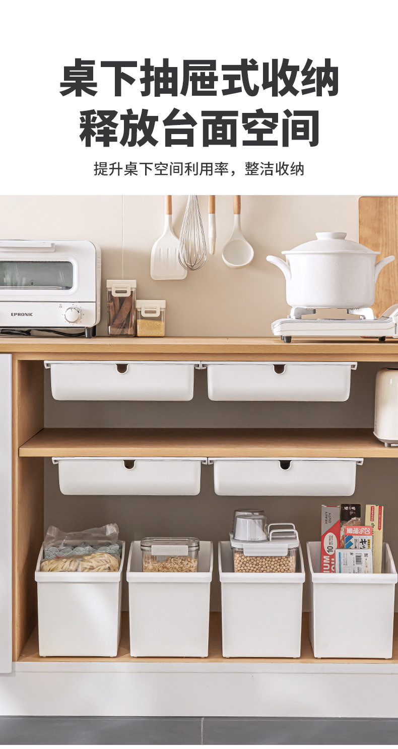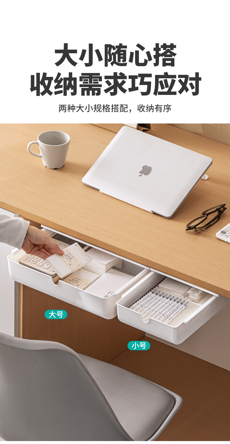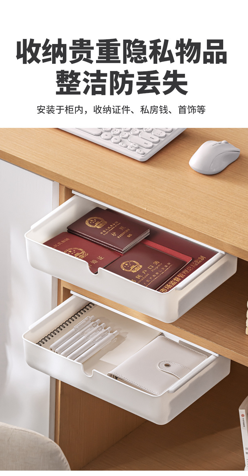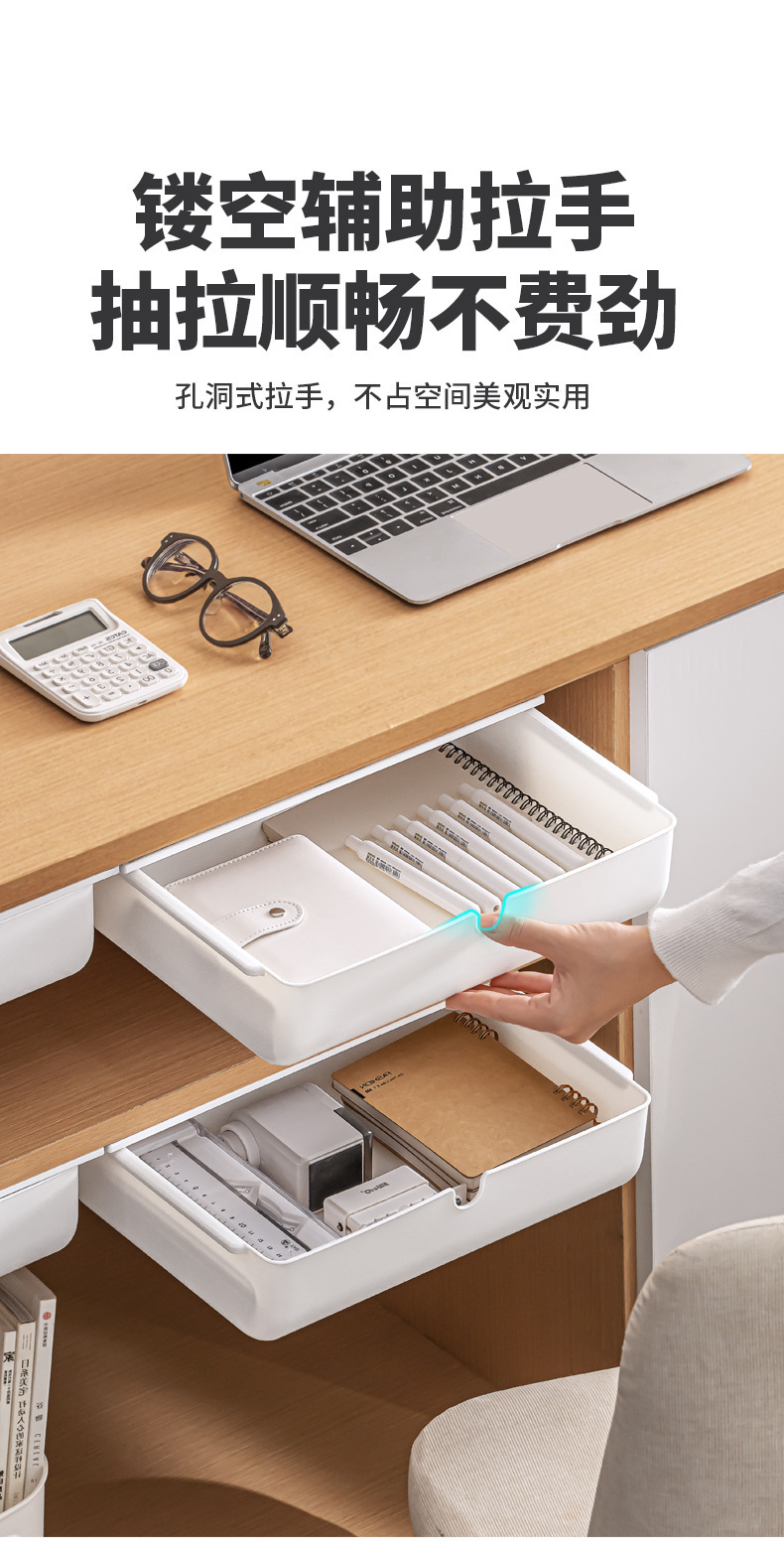 【 介 绍】:桌下收纳盒,选用优良PS材质。安装于桌面下方,释放台面空间,抽屉式设计,取物便捷顺手。配备稳固无痕胶贴,安装便捷省心。适用于多个居家场景,轻松拓展收纳空间。