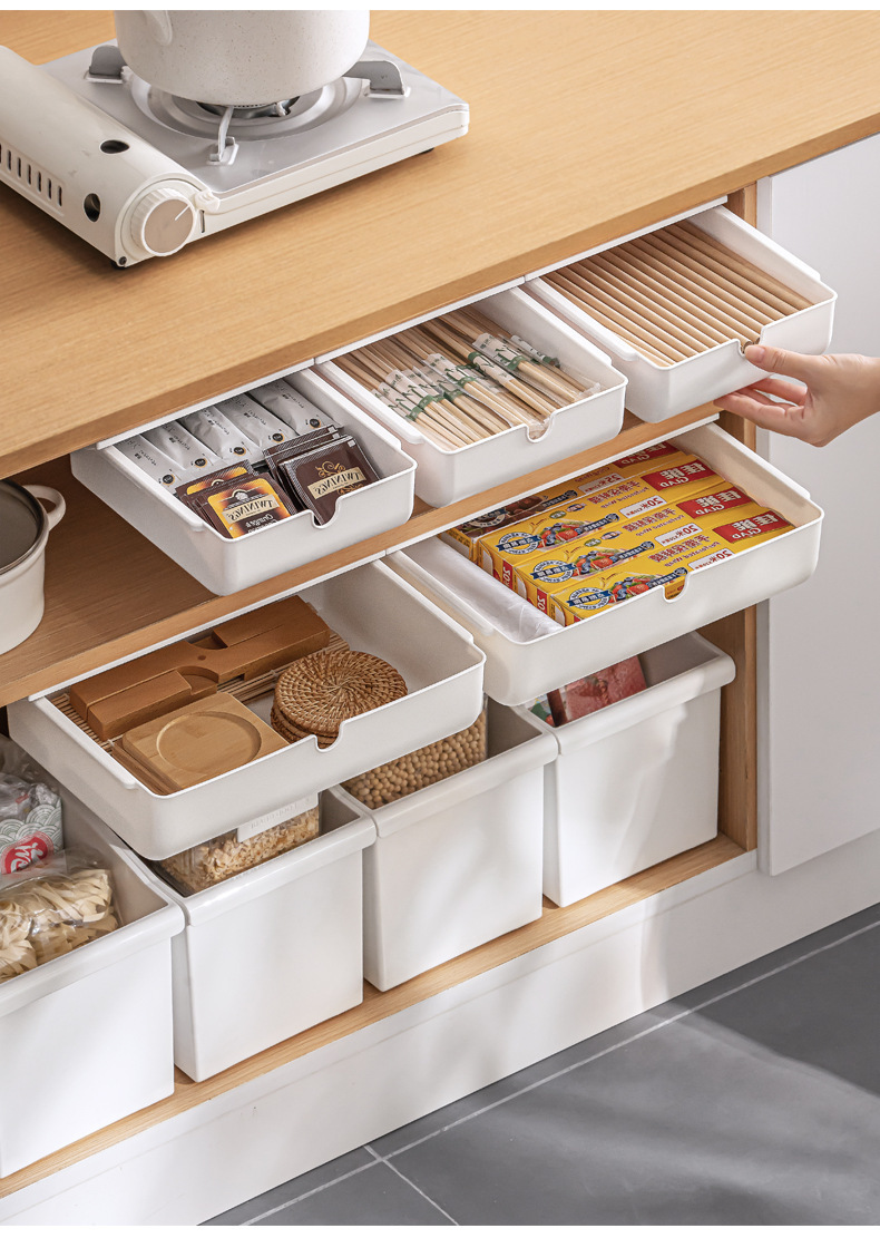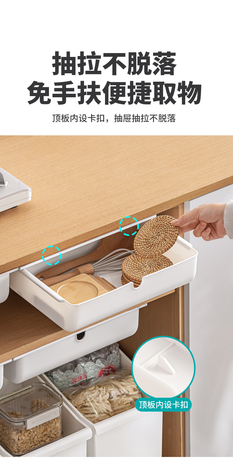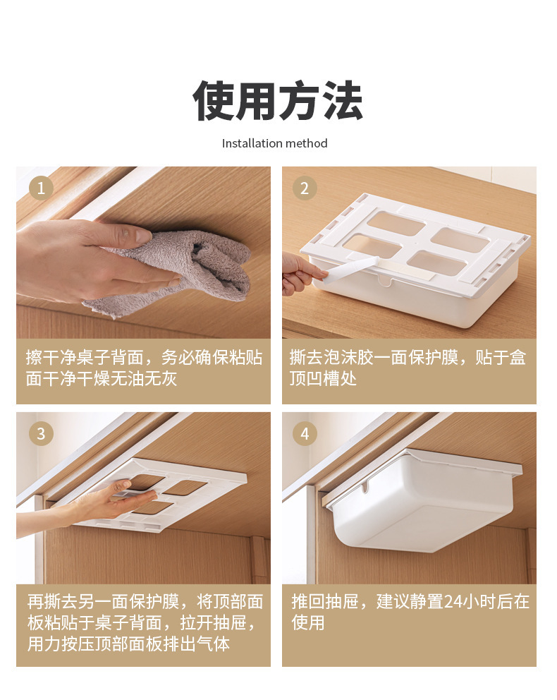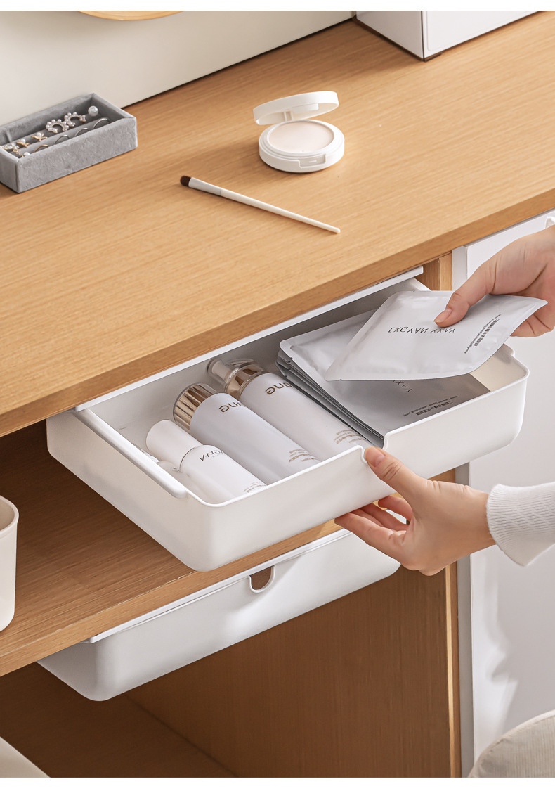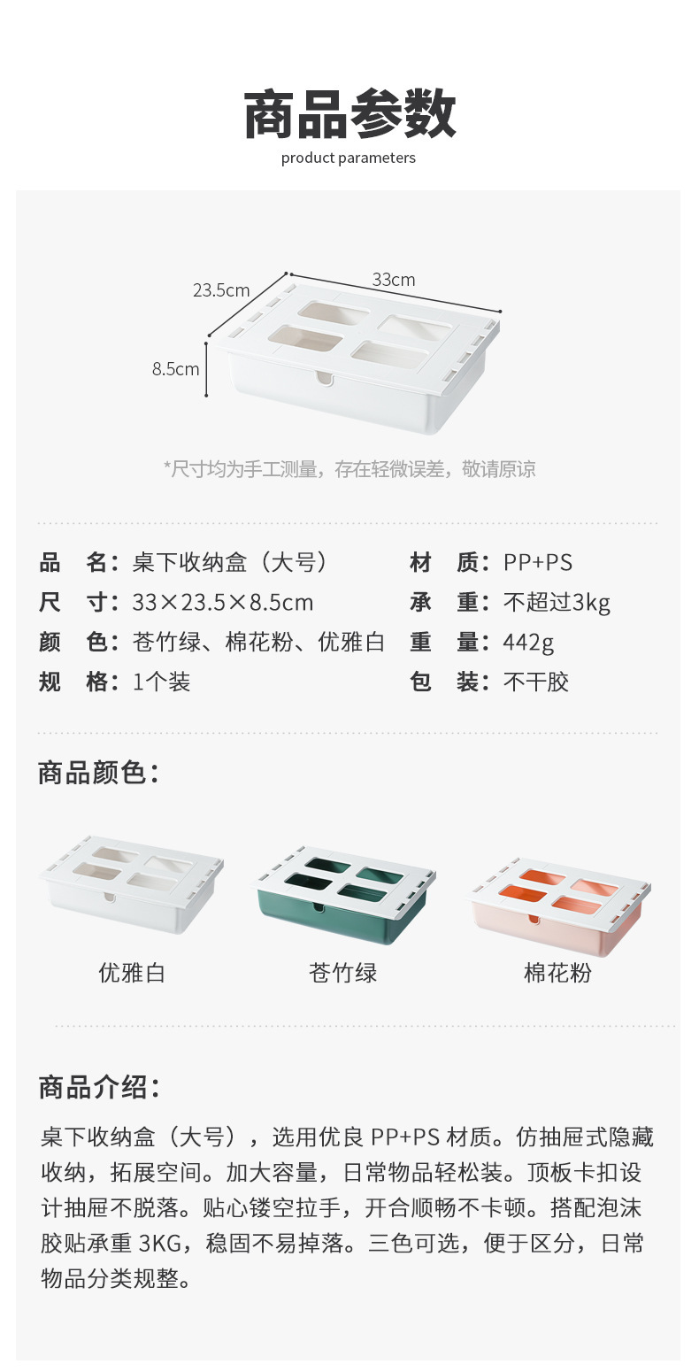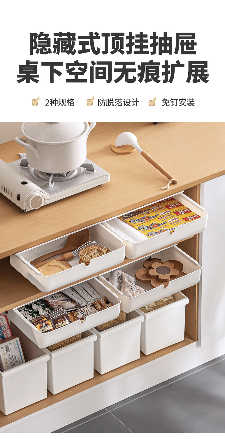 【 介 绍】:桌下收纳盒,选用优良PS材质。安装于桌面下方,释放台面空间,抽屉式设计,取物便捷顺手。配备稳固无痕胶贴,安装便捷省心。适用于多个居家场景,轻松拓展收纳空间。
