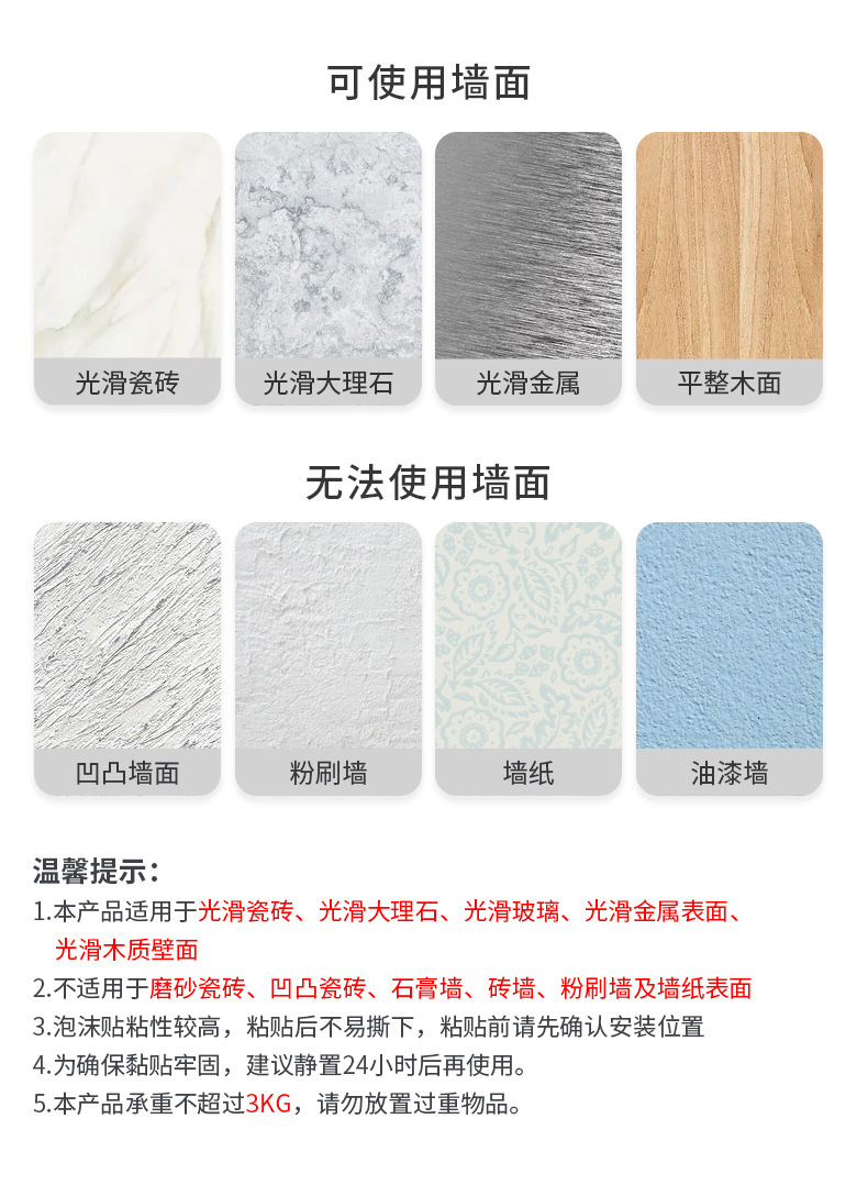 ※本产品配备高粘性背胶,适用于平整的瓷砖、玻璃、木纹面等黏贴面。