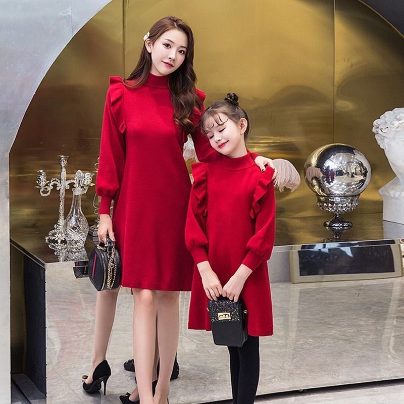 인터넷 연예인 부모-자식 세트 여자의 느슨한 서양 스타일 한국 스타일 원피스 레이스 라운드 목 긴 소매 두꺼운 빨간 치마스토어 가기