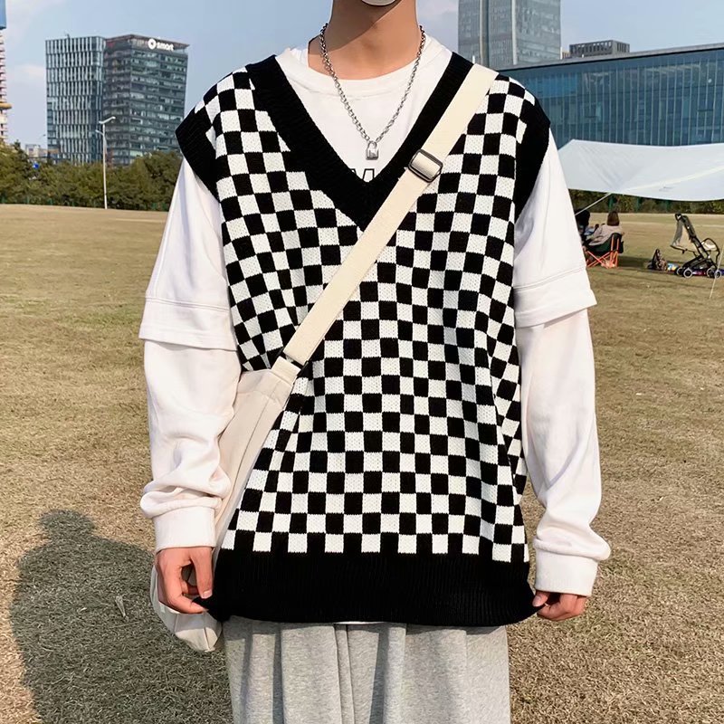 트렌디 한 흑백 체스 판 격자 무늬 니트 조끼 여성용 V-넥 느슨한 외부 게으른 스타일 스택 조끼 커플스토어 가기