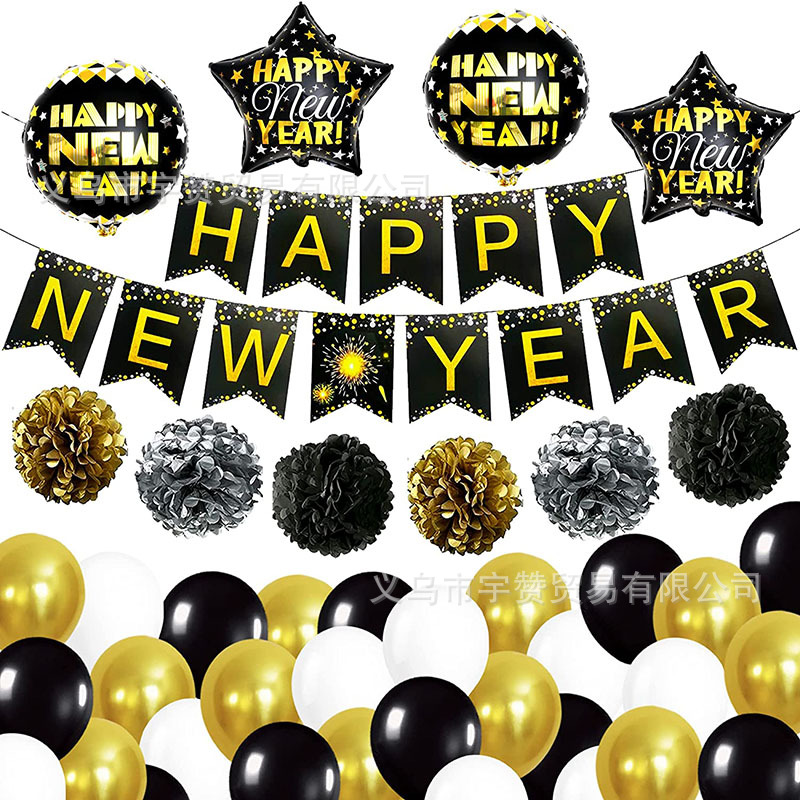 크로스 국경 해피 뉴 이어 골든 블랙 실버 풍선 깃발 세트 새해 전날 장식 새해 풍선 패키지스토어 가기