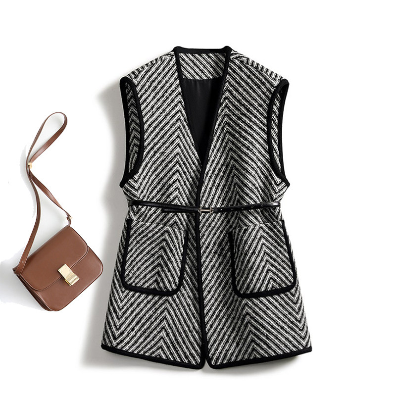 가을과 겨울 새로운 스타일 샤넬 스타일 조끼 여성 흑백 헤링본 외부 울 트위드 조끼 유행 재킷스토어 가기