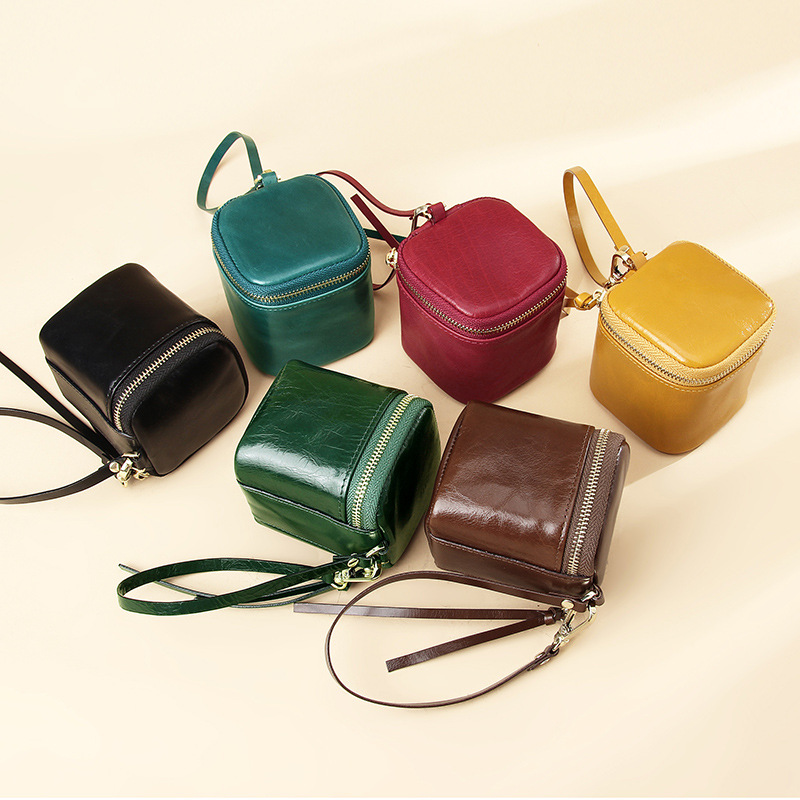 油蜡皮真皮手拎水桶包ins复古风小众口红小物件收纳硬币零钱包女