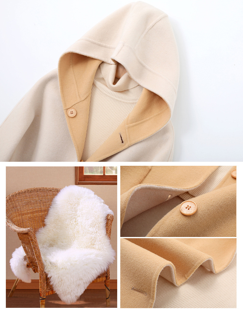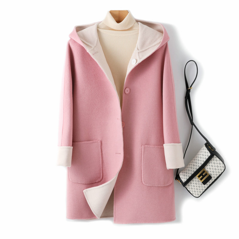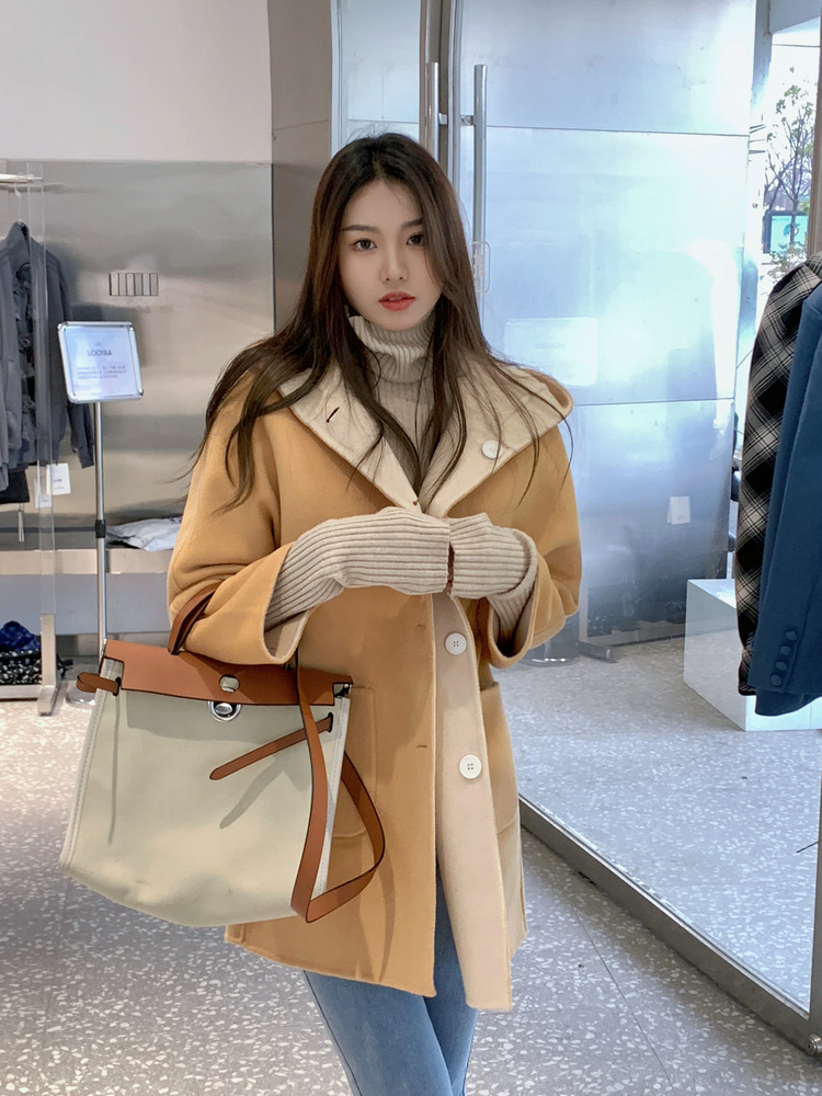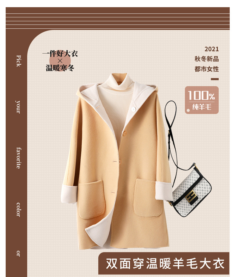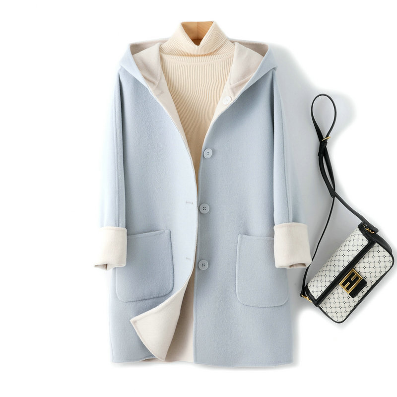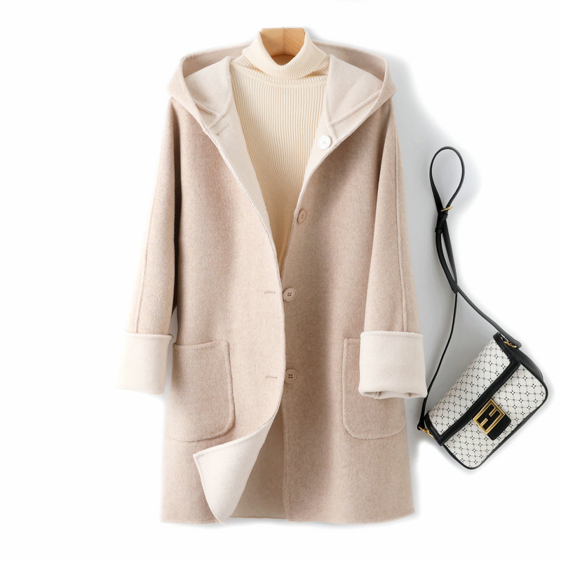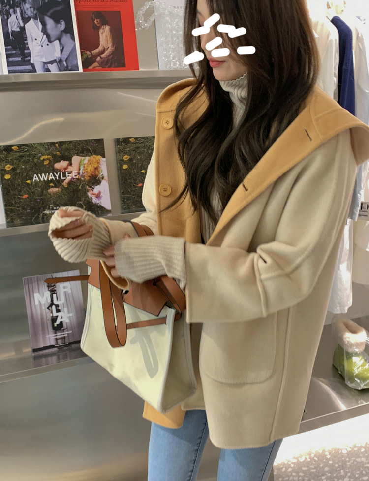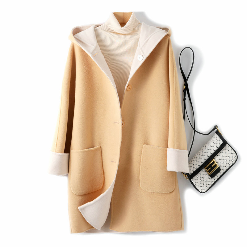 뒤집어 입을 수 있는 여성용 후드 양면 캐시미어 코트 2025 가을 겨울 순모 모직 코트 작은 노란색스토어 가기