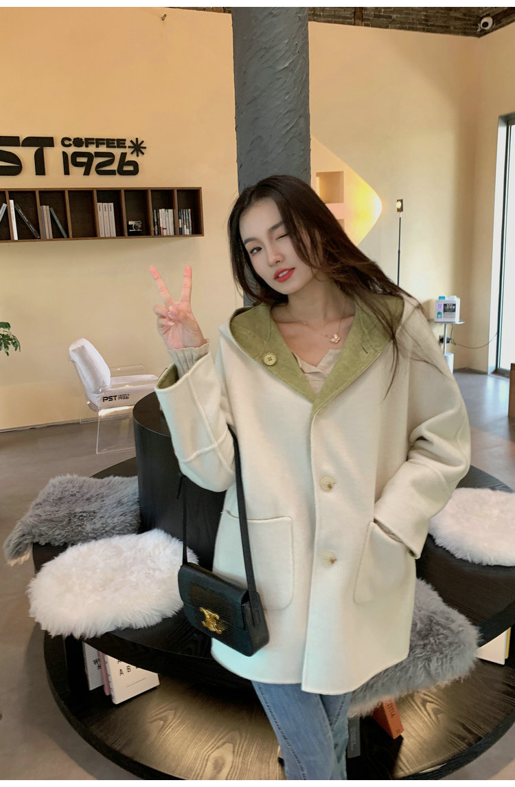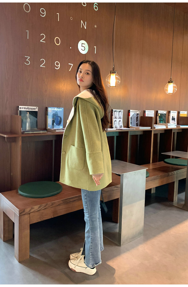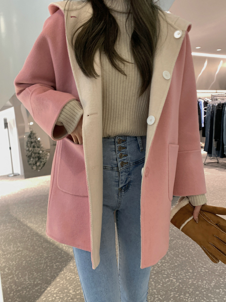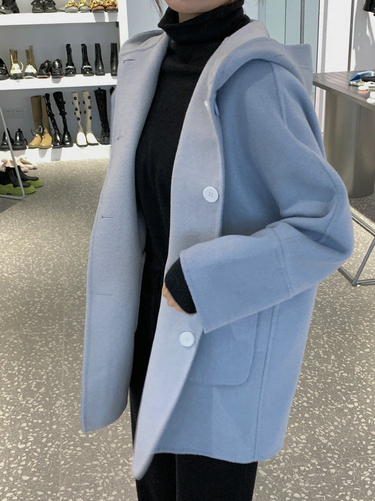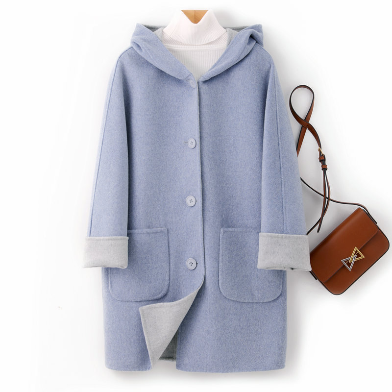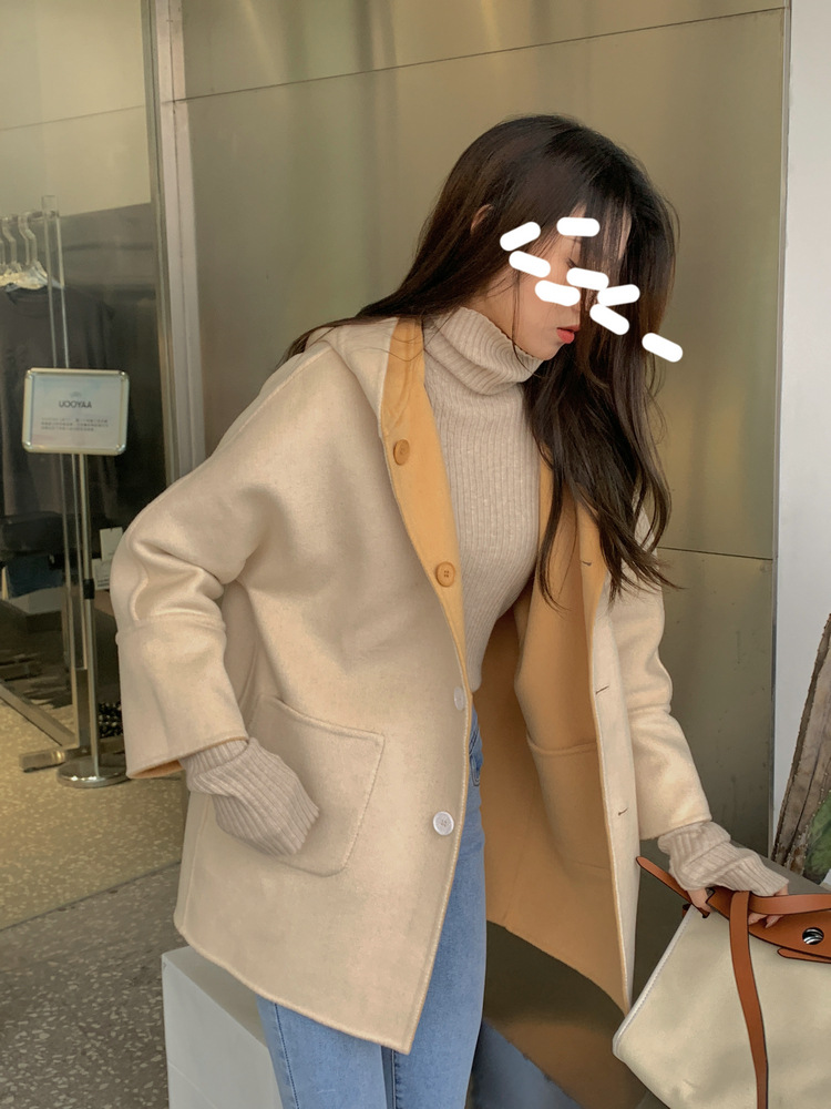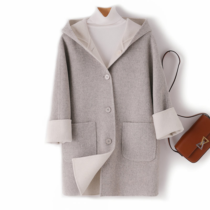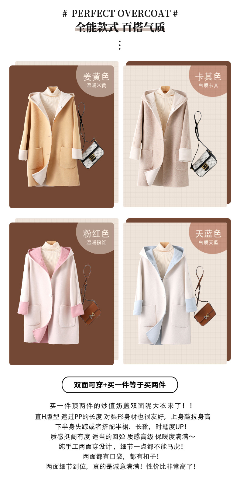 뒤집어 입을 수 있는 여성용 후드 양면 캐시미어 코트 2025 가을 겨울 순모 모직 코트 작은 노란색스토어 가기
