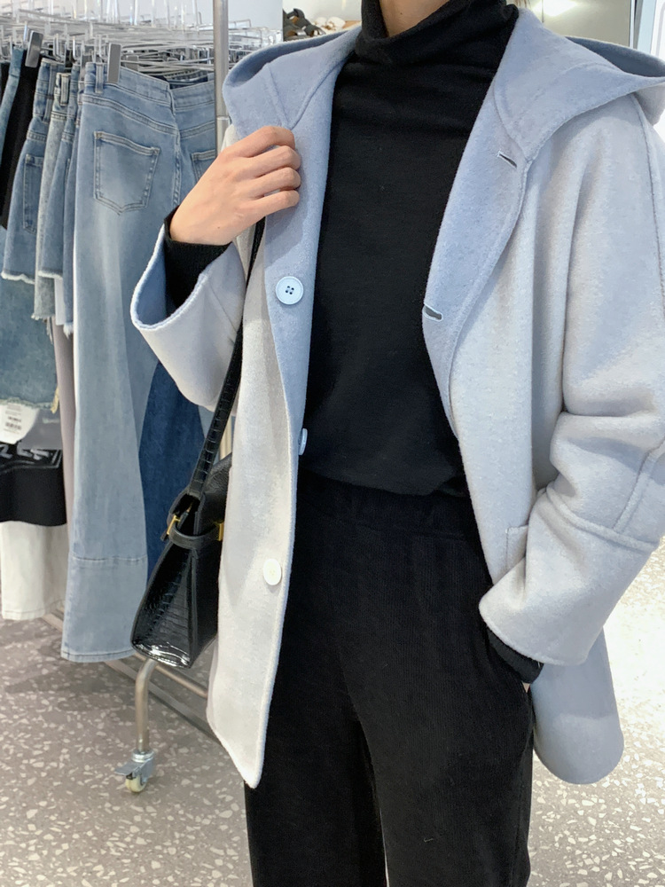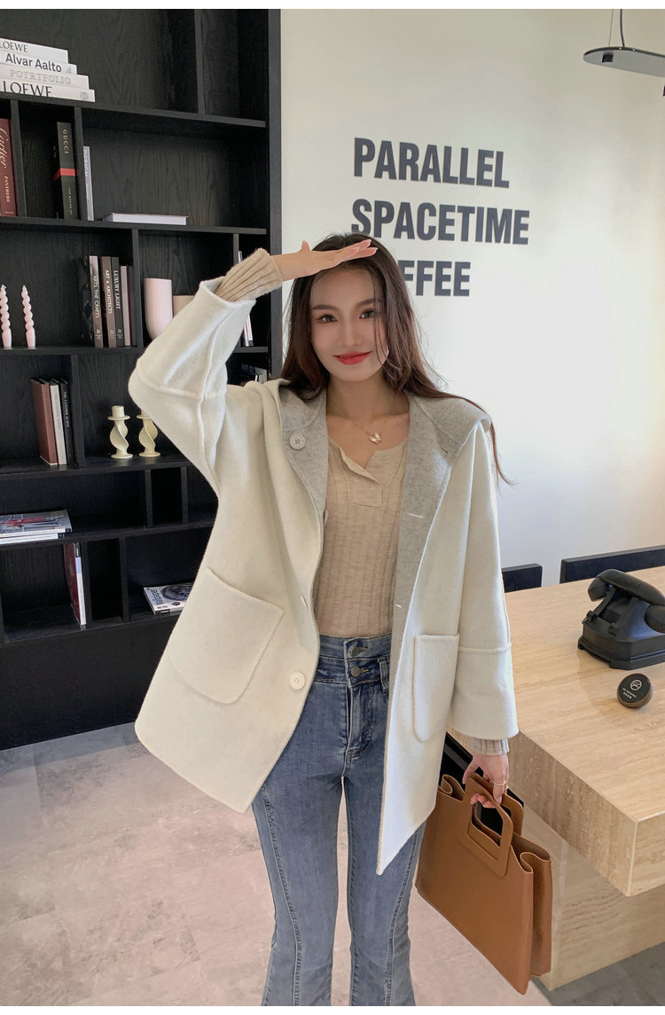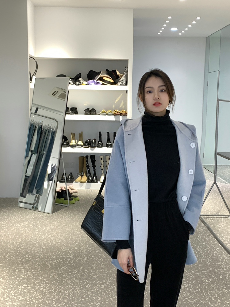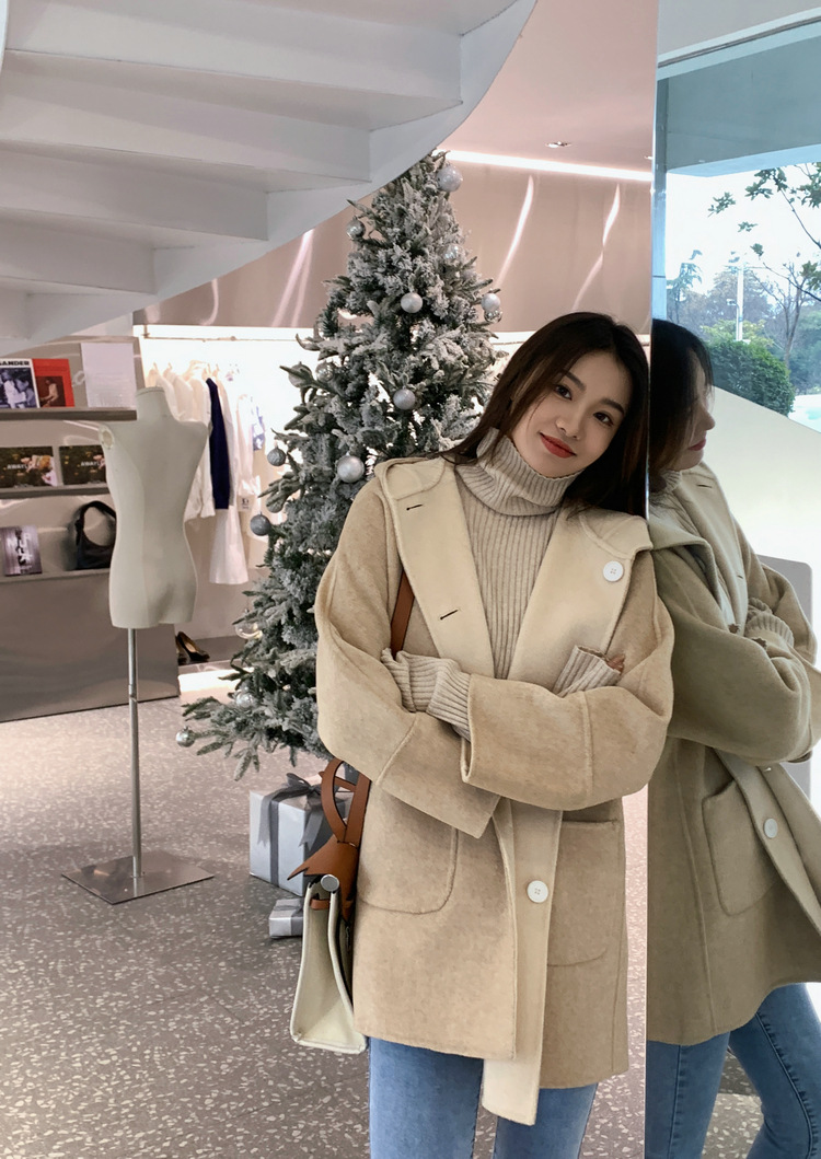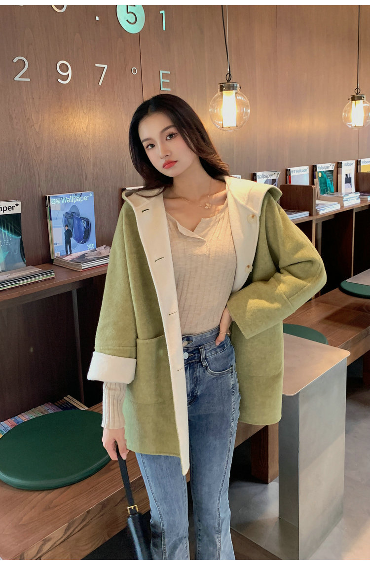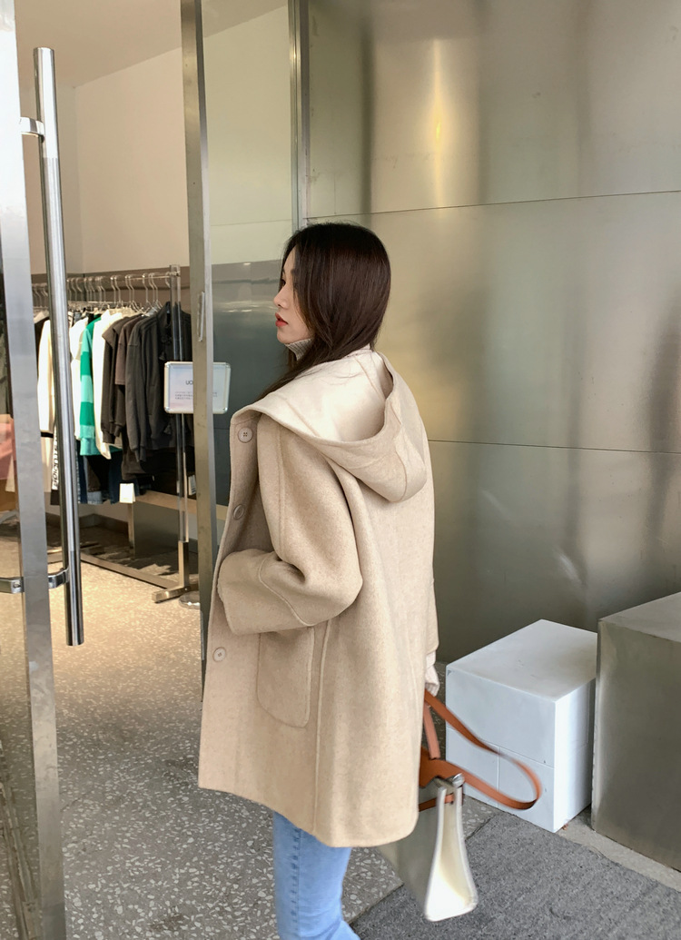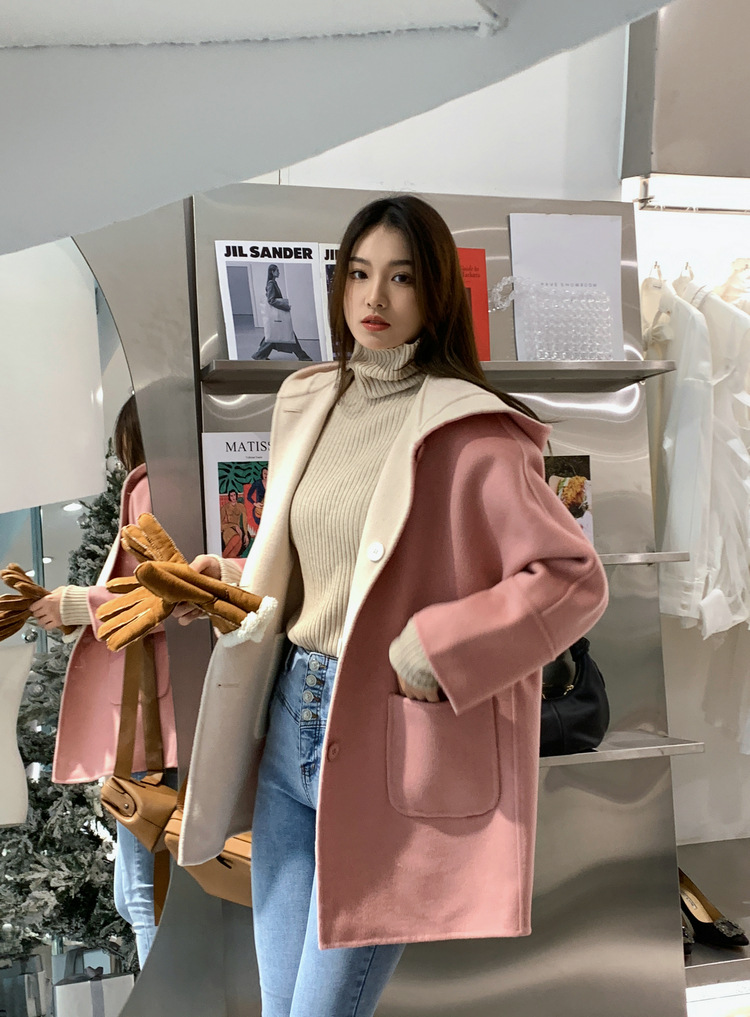 뒤집어 입을 수 있는 여성용 후드 양면 캐시미어 코트 2025 가을 겨울 순모 모직 코트 작은 노란색스토어 가기
