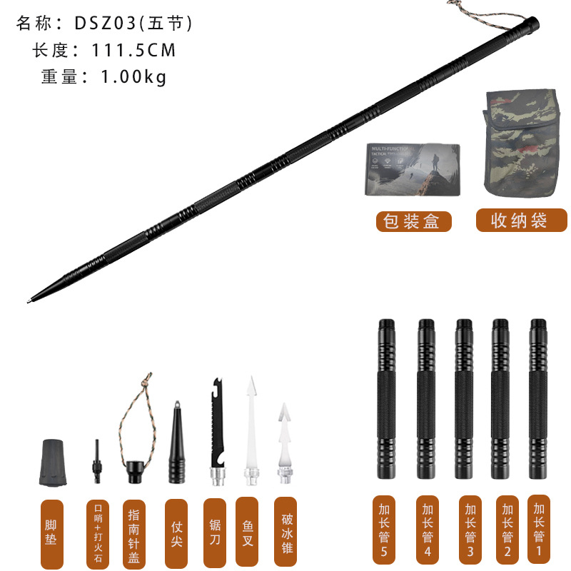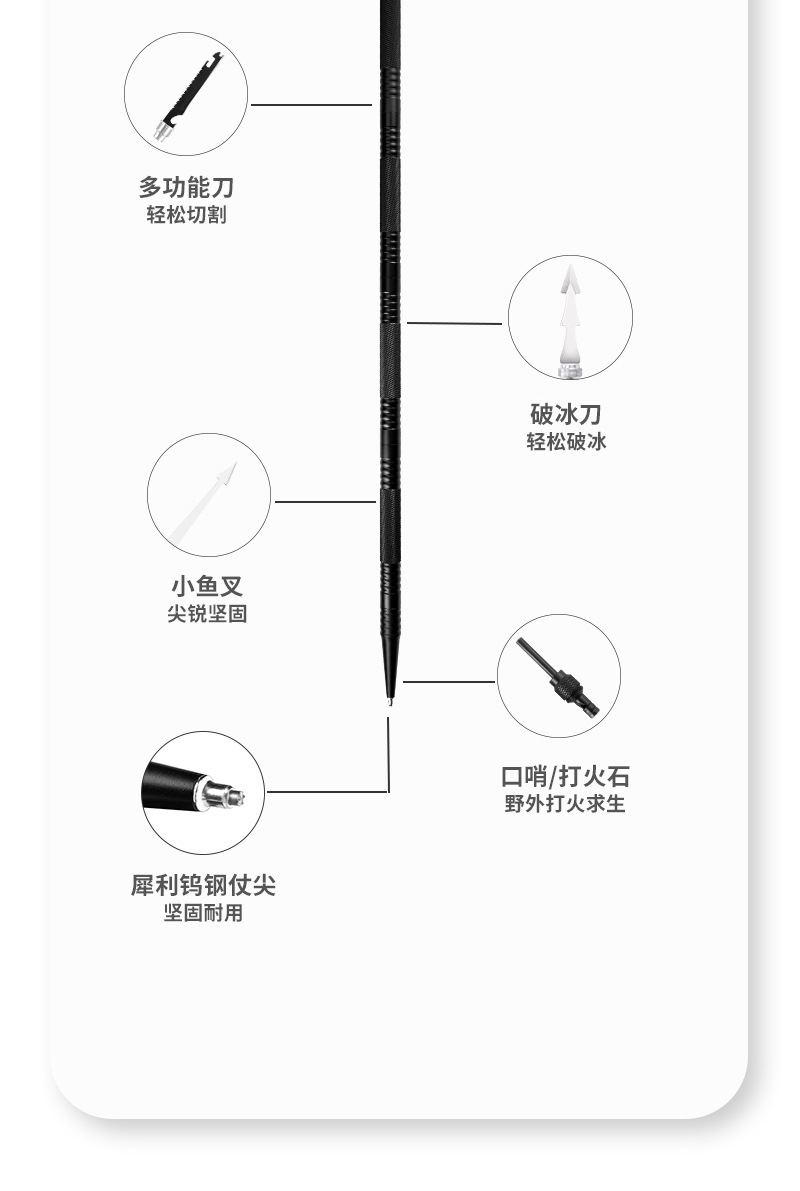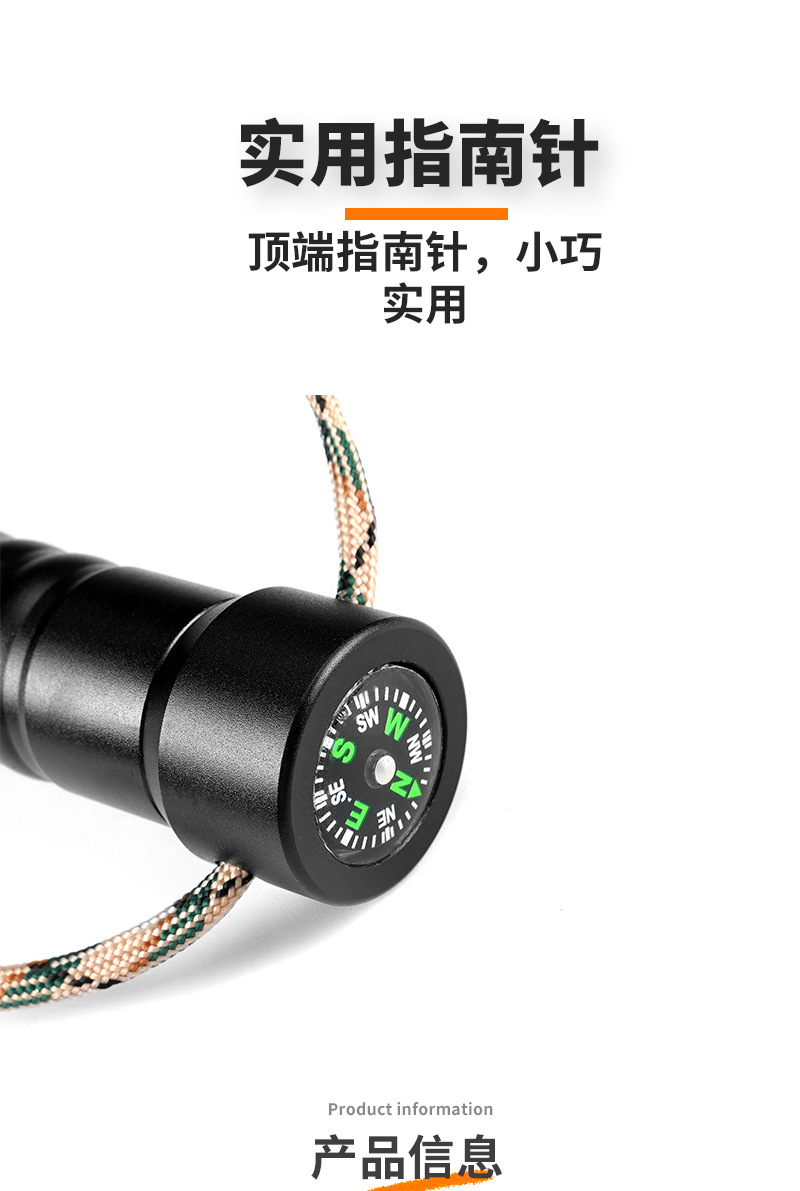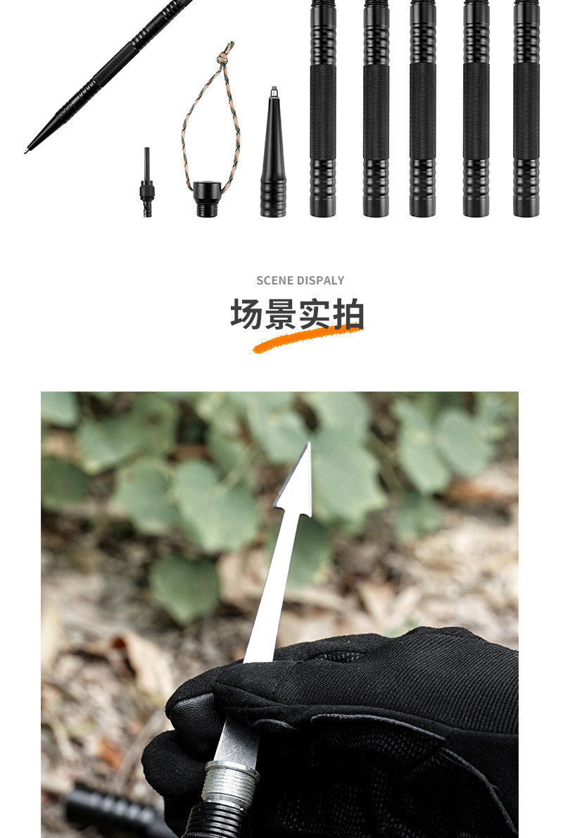 功能介绍: 叉鱼 割 刺 锯 破 撬 切 打火 口哨 防身棍 开瓶器 割绳 防身 求救口哨 指南针