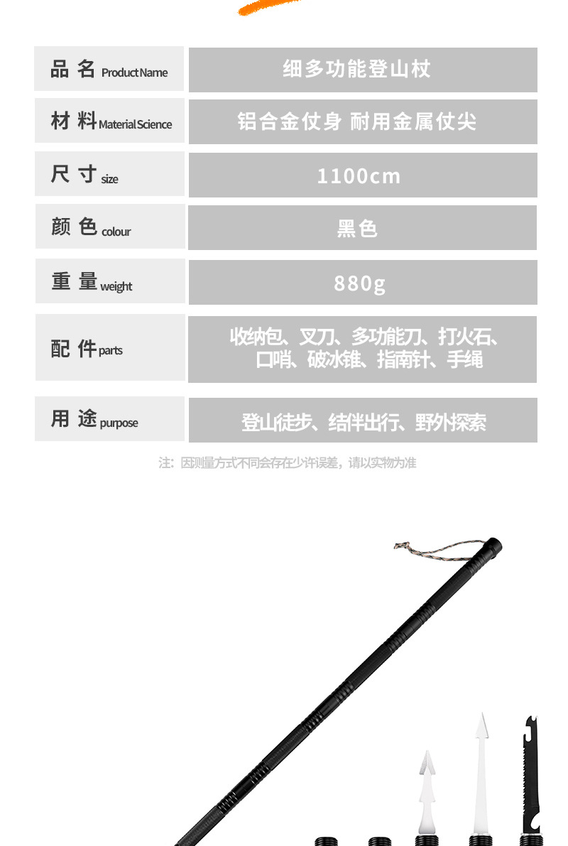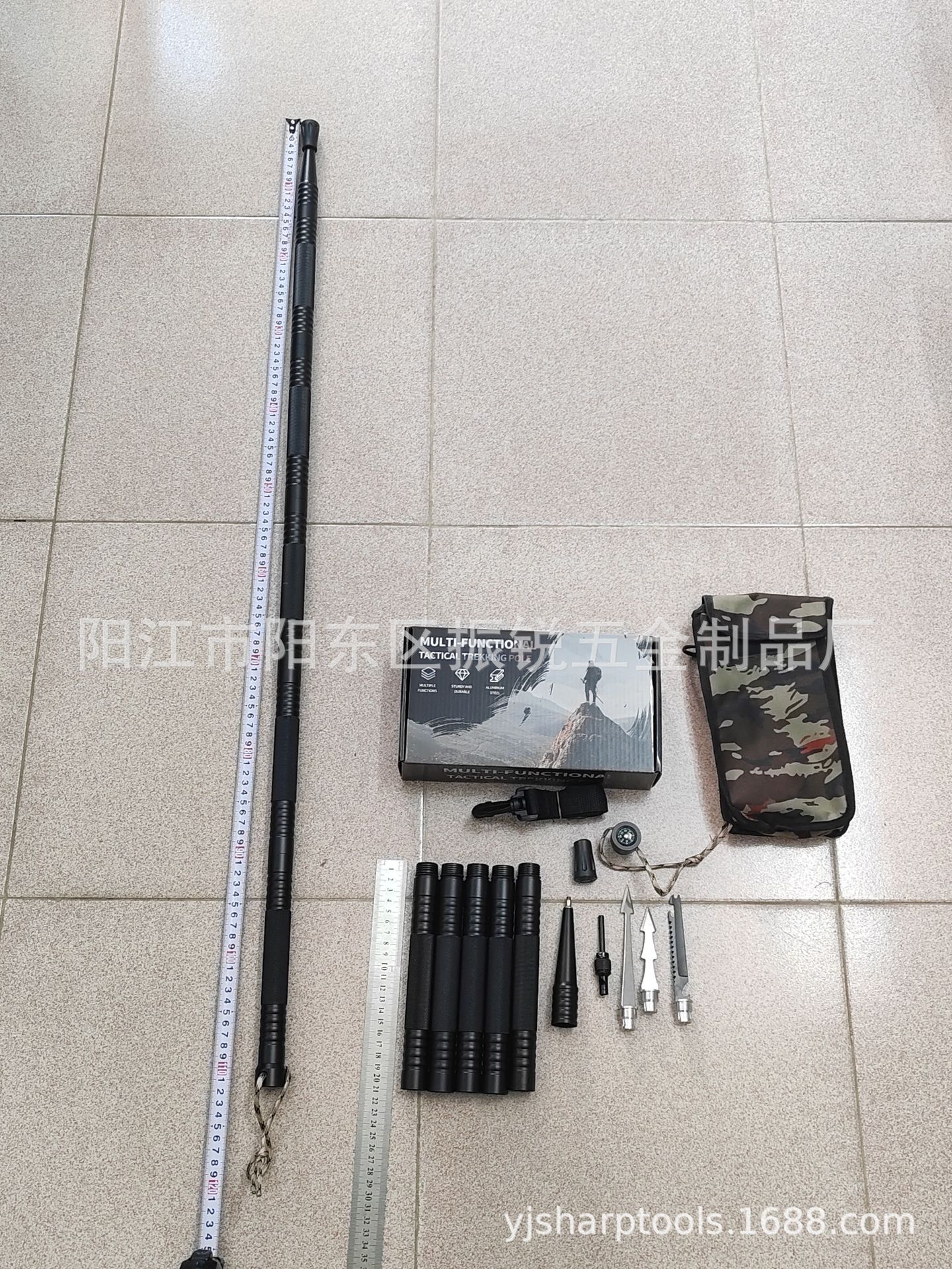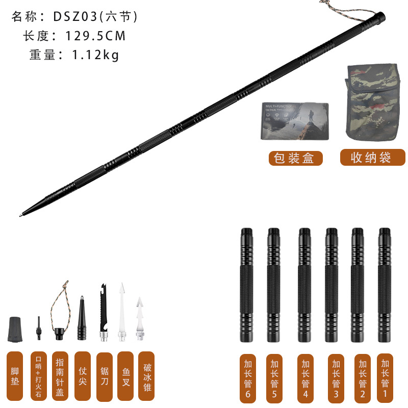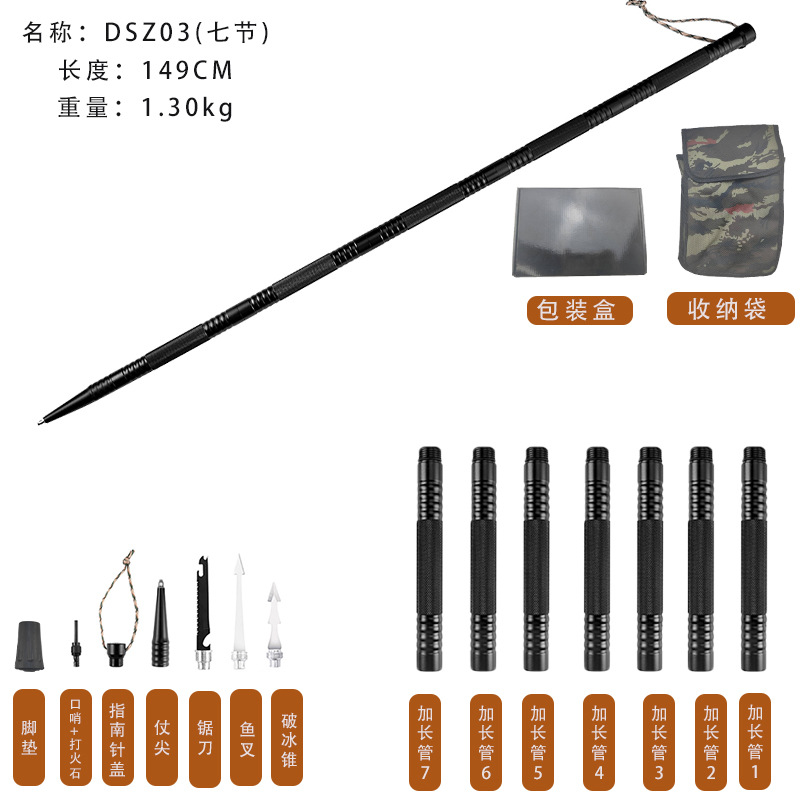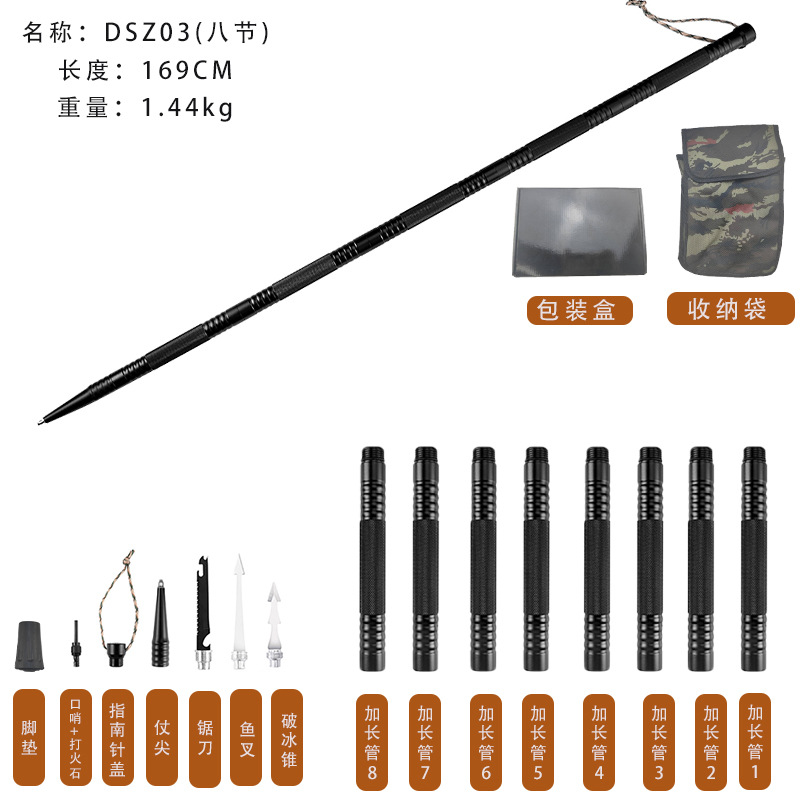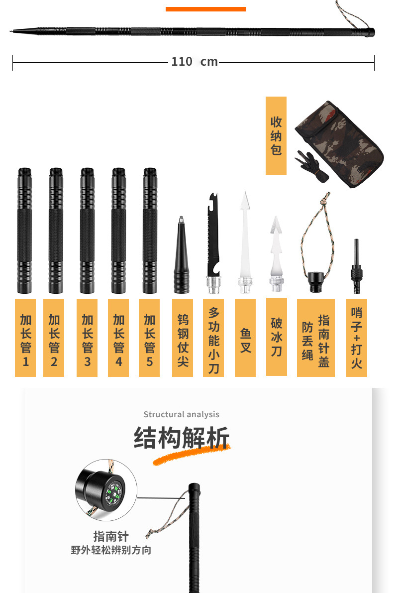 产品清单: 杆*5,仗尖*1,多功能小刀*1 鱼叉*1 ,铝合金口哨打火石*1,破冰锤*1, 指南针尾部*1 军绿色尾绳*1 中性彩盒*1