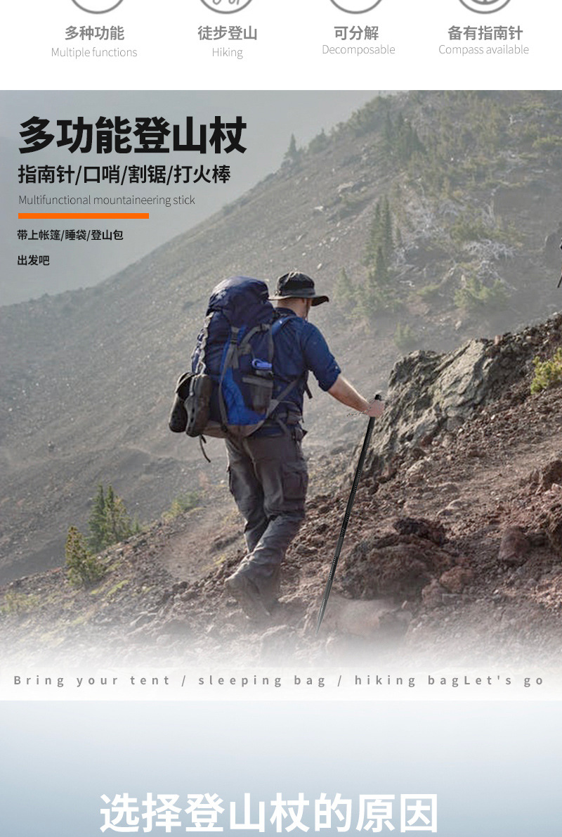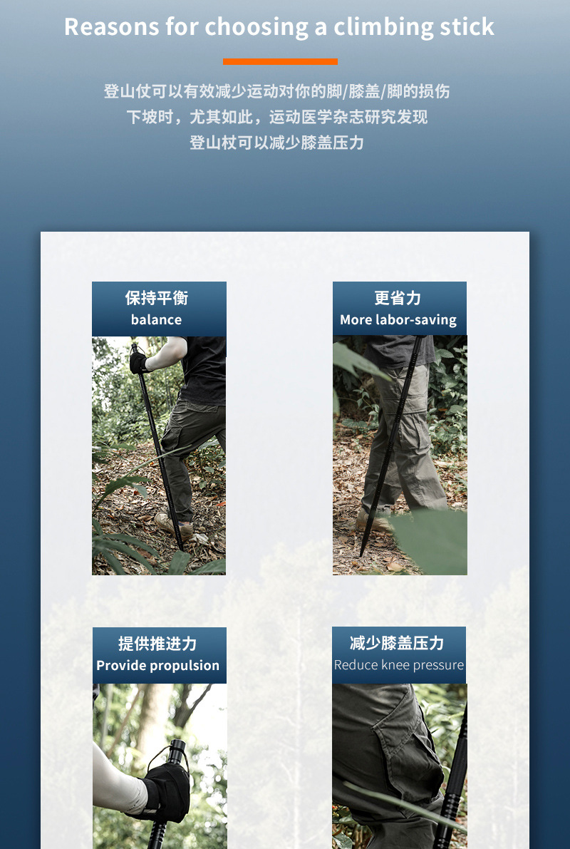 3. 禁止不当使用:不可将登山杖当作撬棍、支撑重物的工具,避免铝合金杖身变形或断裂;刀具仅可用于应急切割(如绳索、布料),禁止作为攻击、玩耍工具。