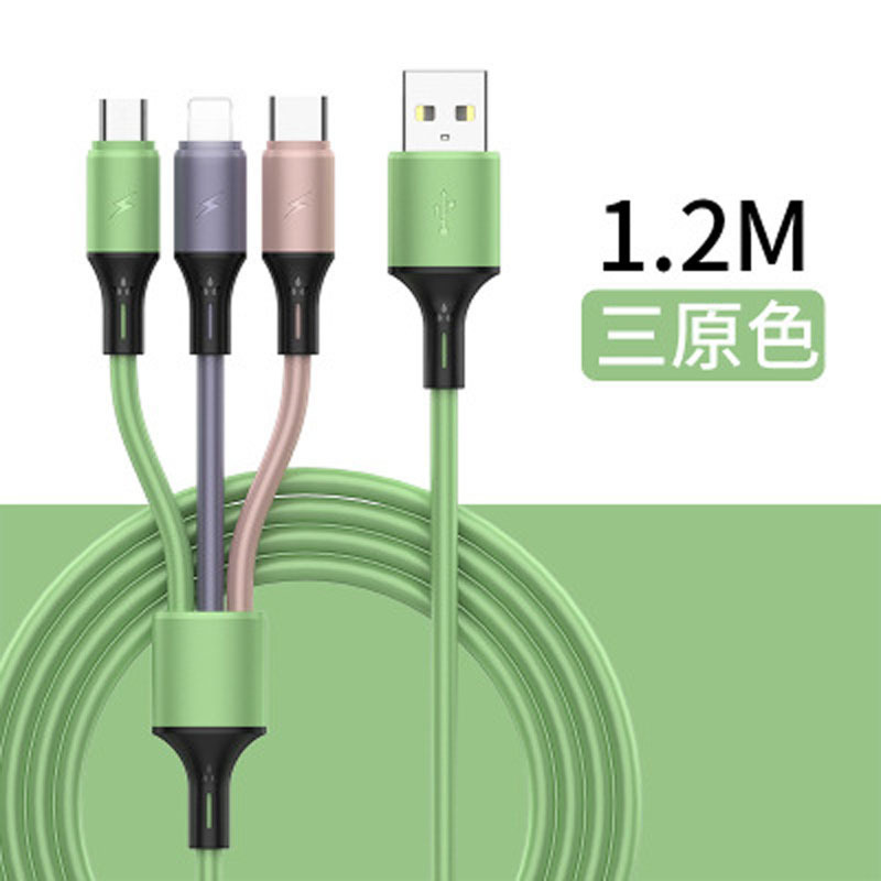 此款为一拖三液态软胶数据线 超大铜丝,极速充电,耐拉伸,防缠绕,壳子设计小巧,精致, 款式新颖 打破传统款式