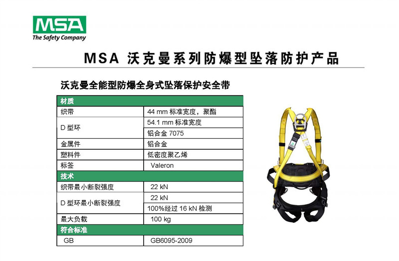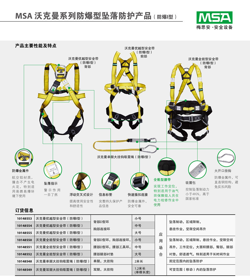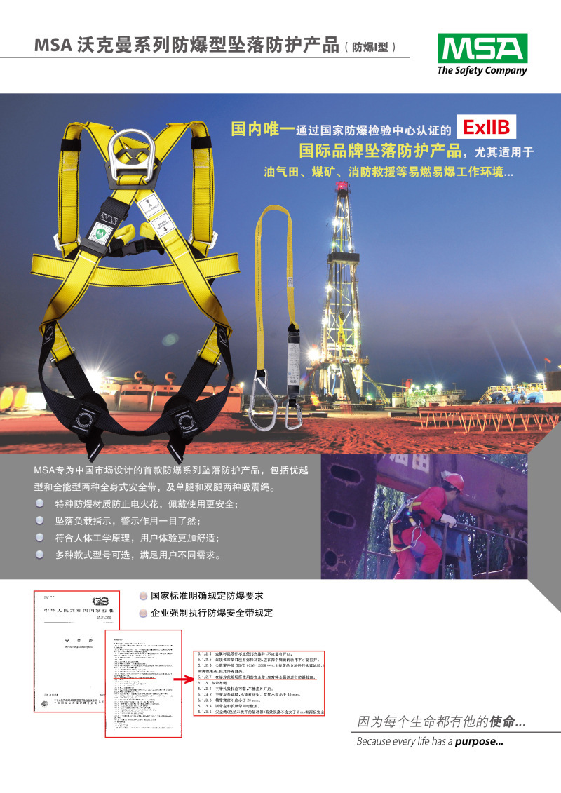 • MSA为中国市场设计的防爆系列坠落防护产品,它也是国内通过国家防爆检验中心认证的国际品牌坠落防护产品,尤其适用于油气田、煤矿、消防救援等易燃易爆工作环境;