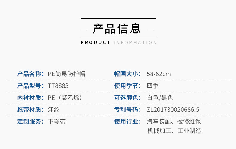 • 흰색 PE 모자 안감 + 검은 색 턱 벨트 (섹션 B)