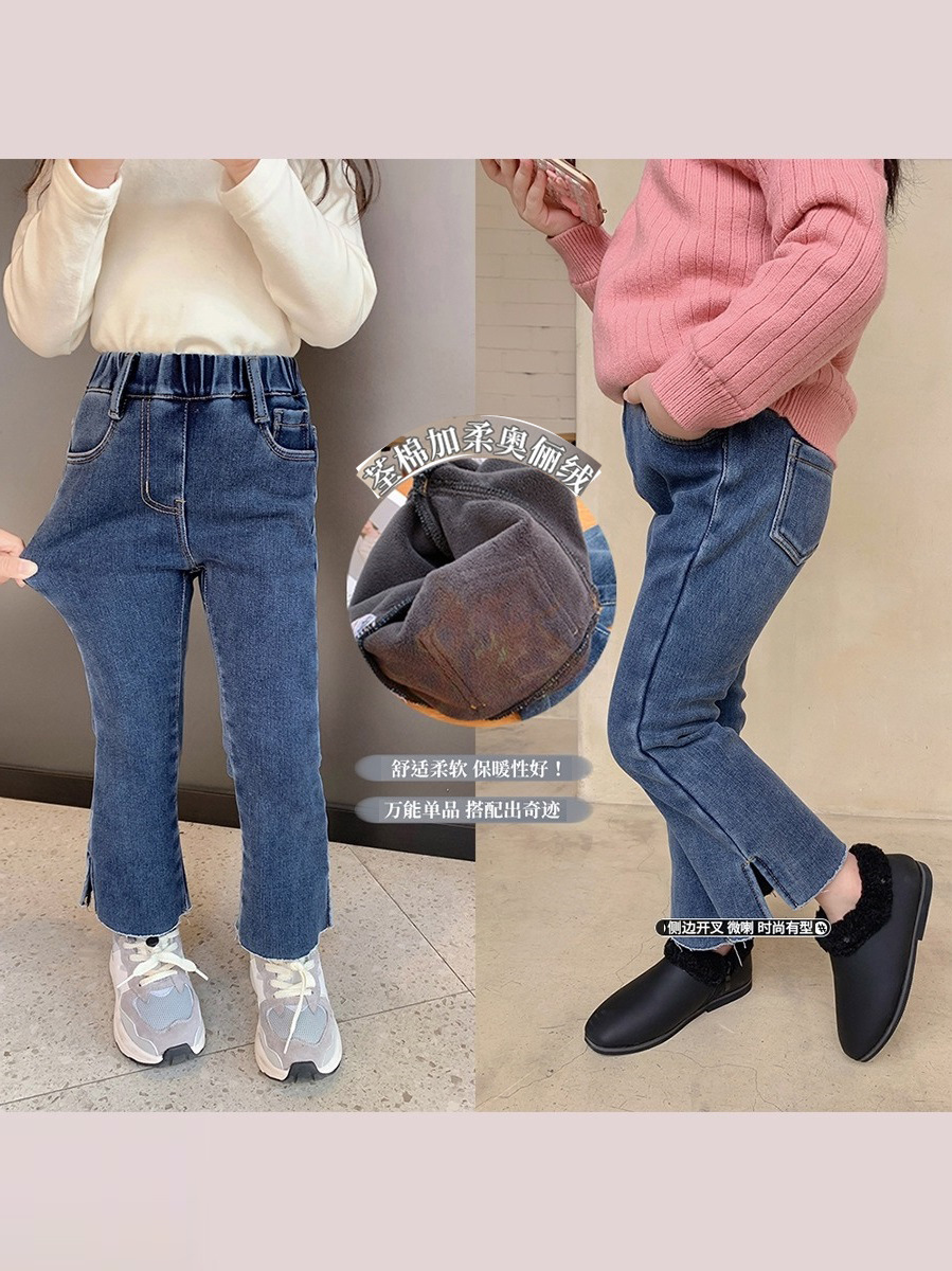 여아 고탄력 데님 플레어 팬츠 기모 겨울 새로운 서양식 아동 아기 원피스 벨벳 사이버 인기 한국 스타일 팬츠