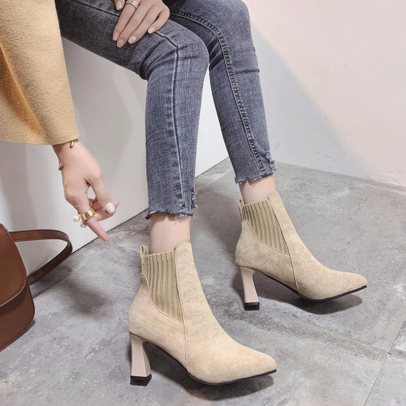여성 신발 2022 가을과 겨울 새로운 한국 스타일 하이힐 패션 청키 힐 뾰족한 첼시 부츠 스웨이드 짧은 배럴 마틴 부츠스토어 가기