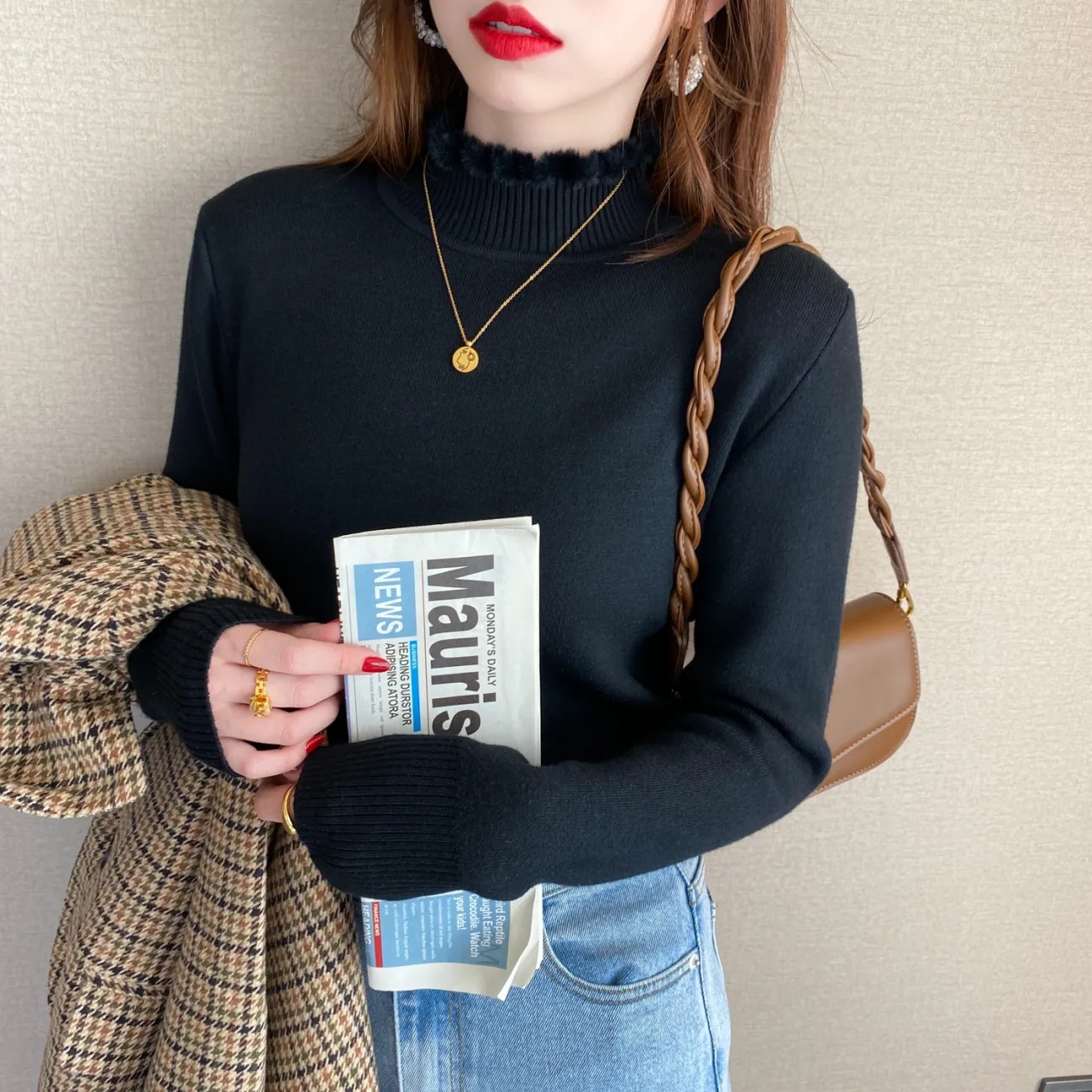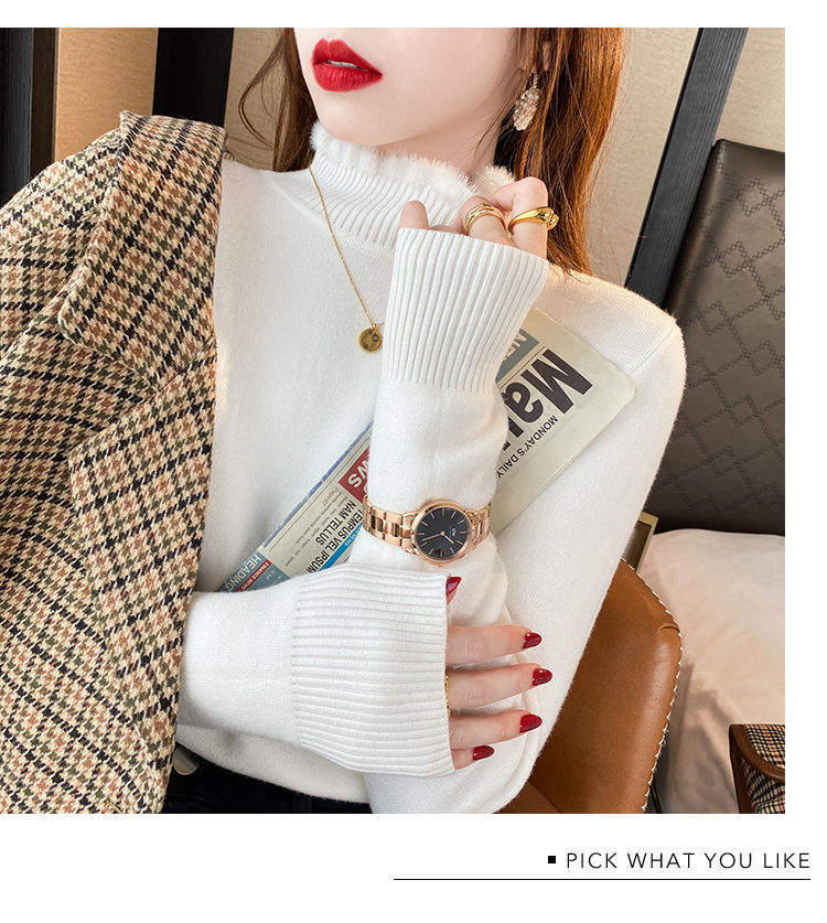 원피스 벨벳 기모 두꺼운 스웨터 여성의 부드러운 찹쌀 라인 2022 새로운 가을과 겨울 니트 세미 하이 칼라 베이스 셔츠스토어 가기