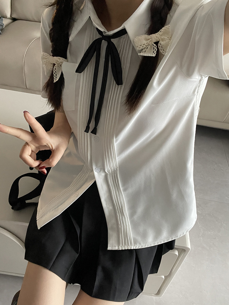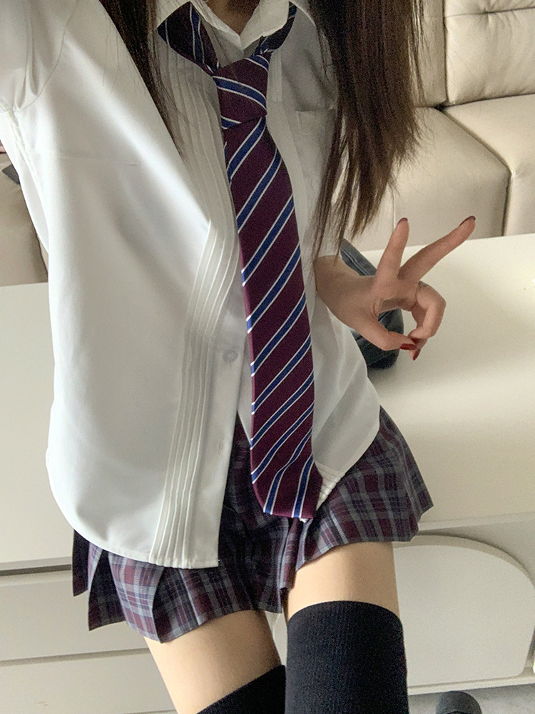 • 반팔 플리츠 화이트 셔츠 + 70cm 블랙 플리츠 스커트 + 블랙 노타이 타이 + 블랙 양말
