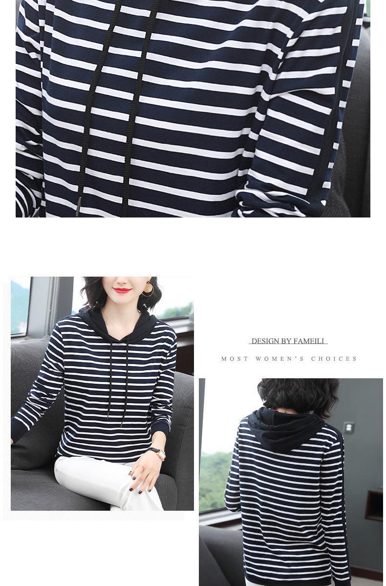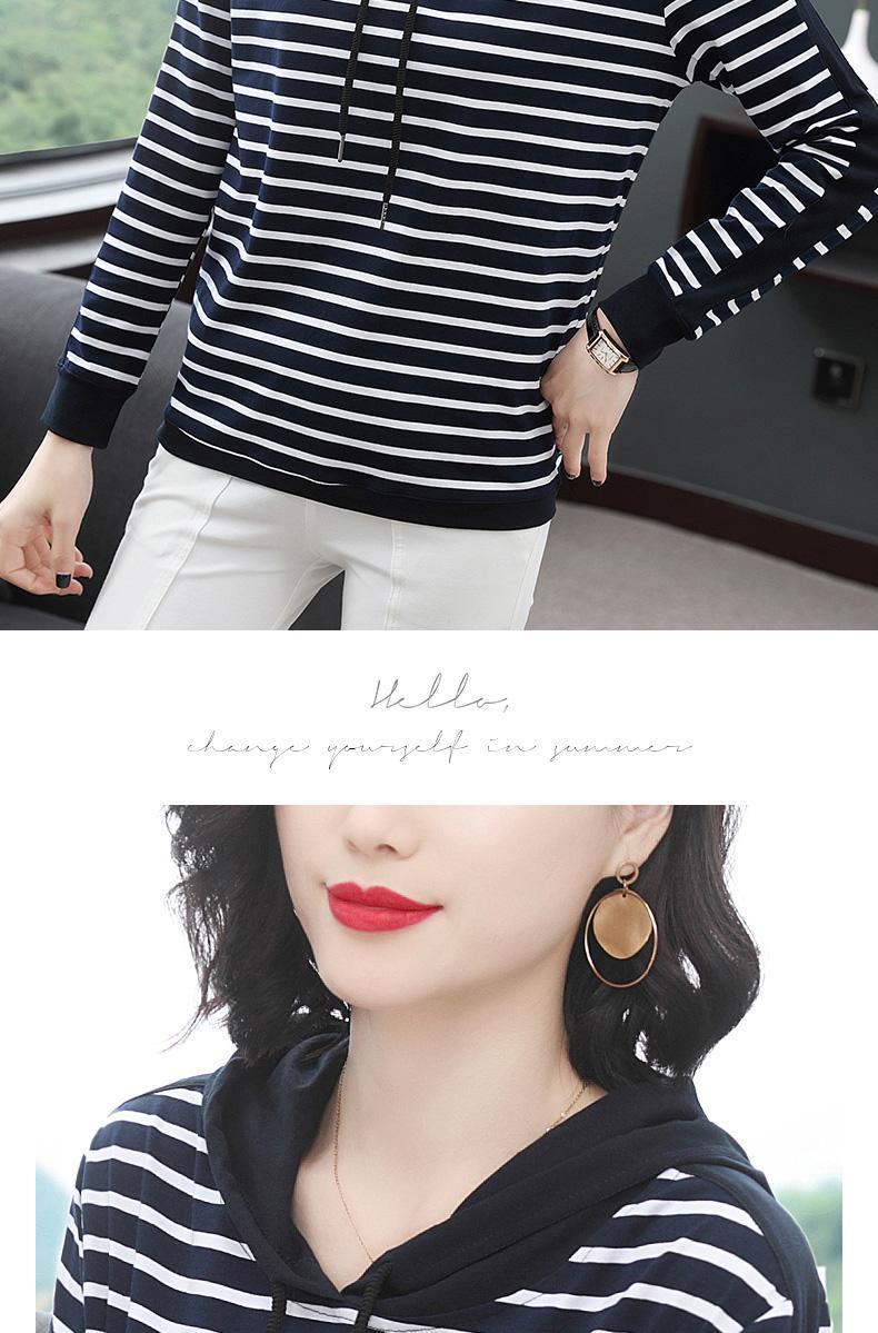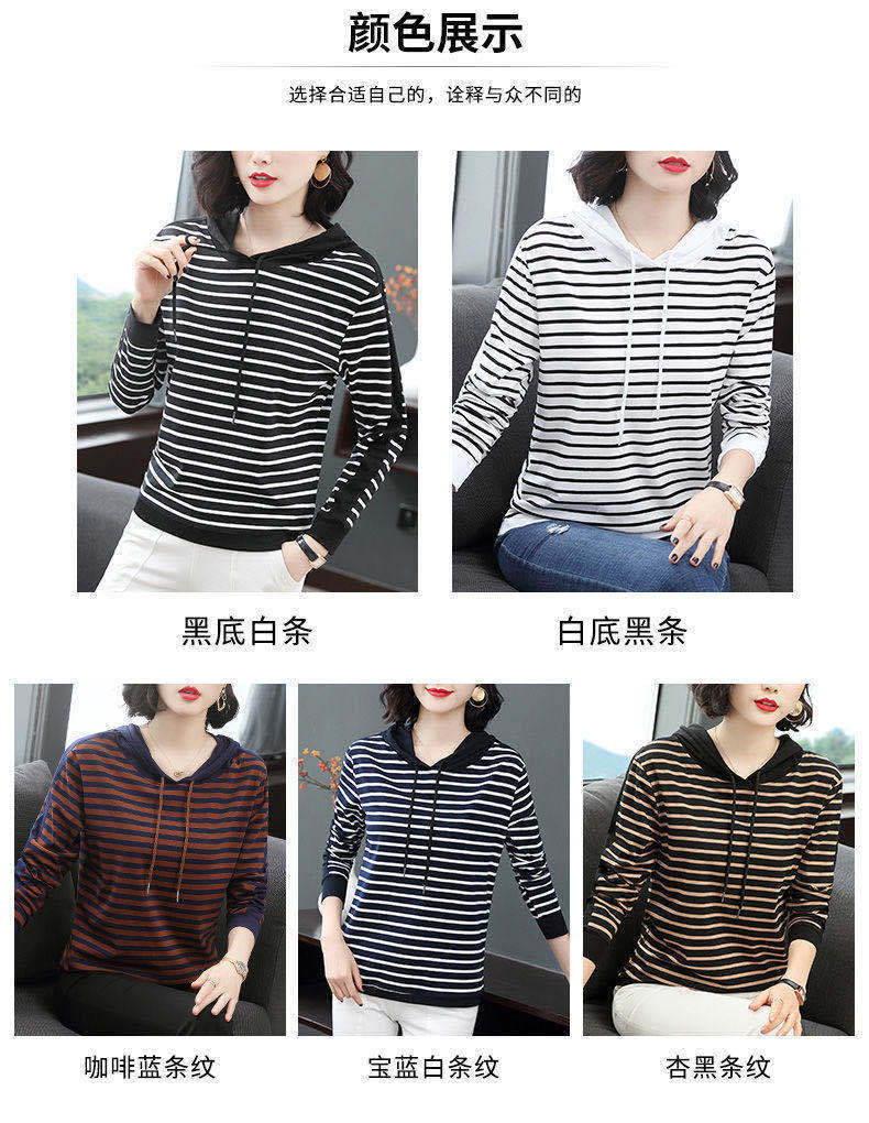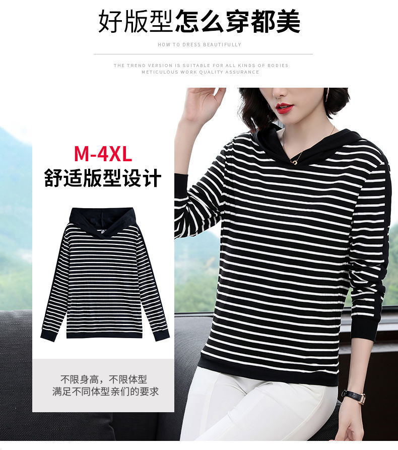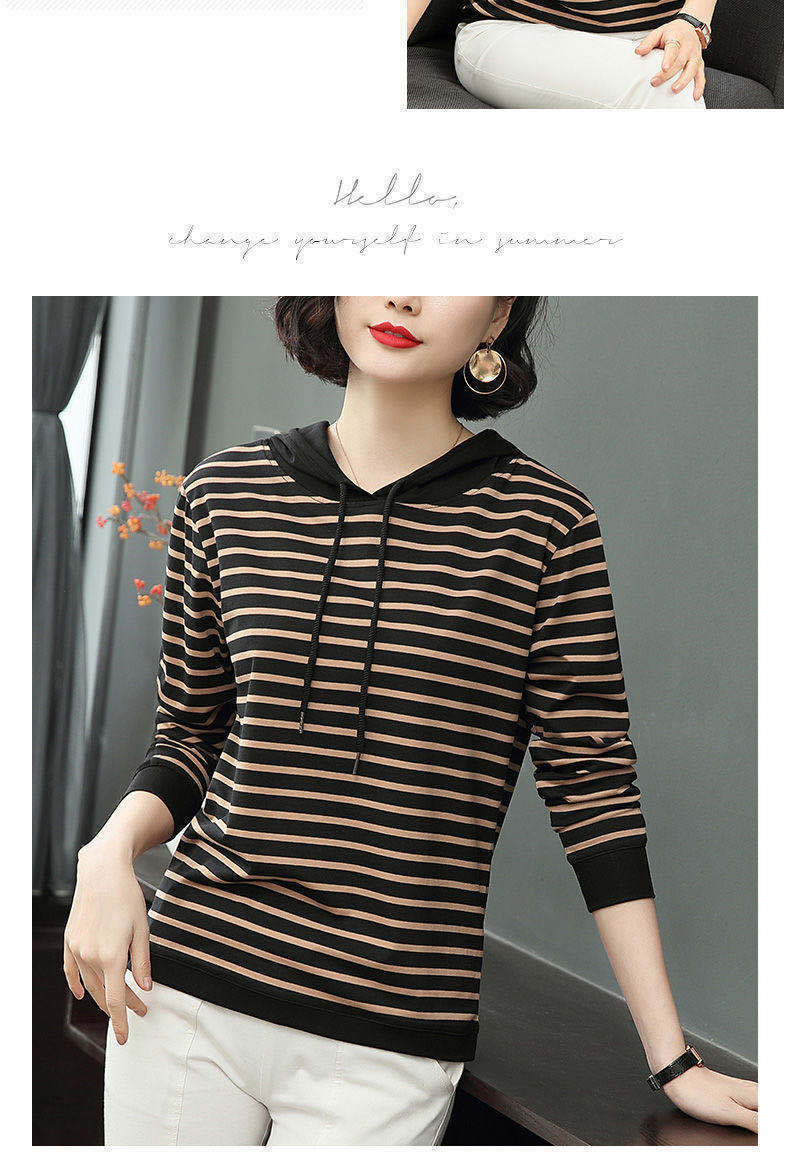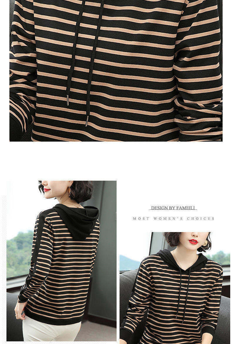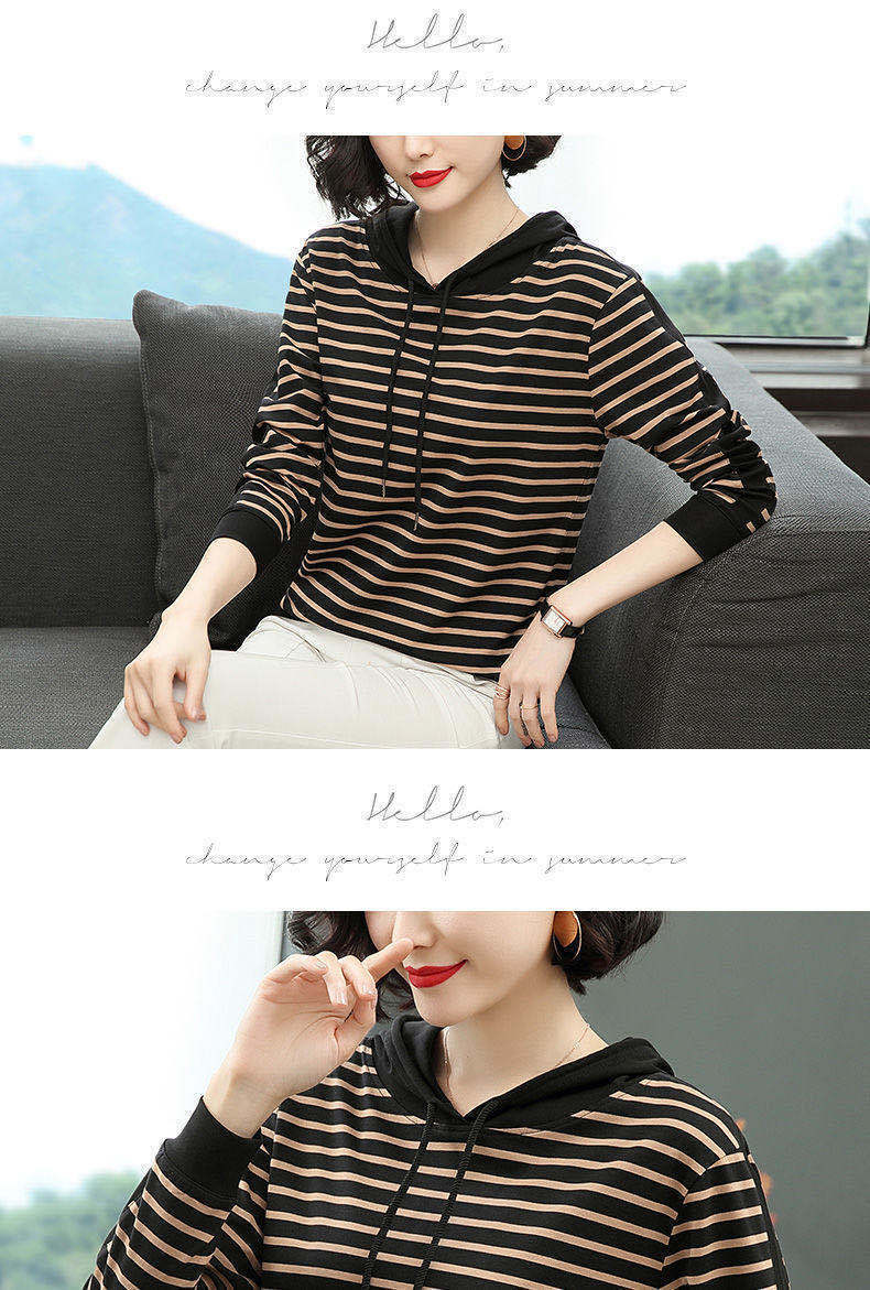 2022 봄과 가을 새로운 스트라이프 티셔츠 여성의 중년 어머니 느슨한 스트라이프 후드 긴팔 플러스 사이즈 여성 상의스토어 가기