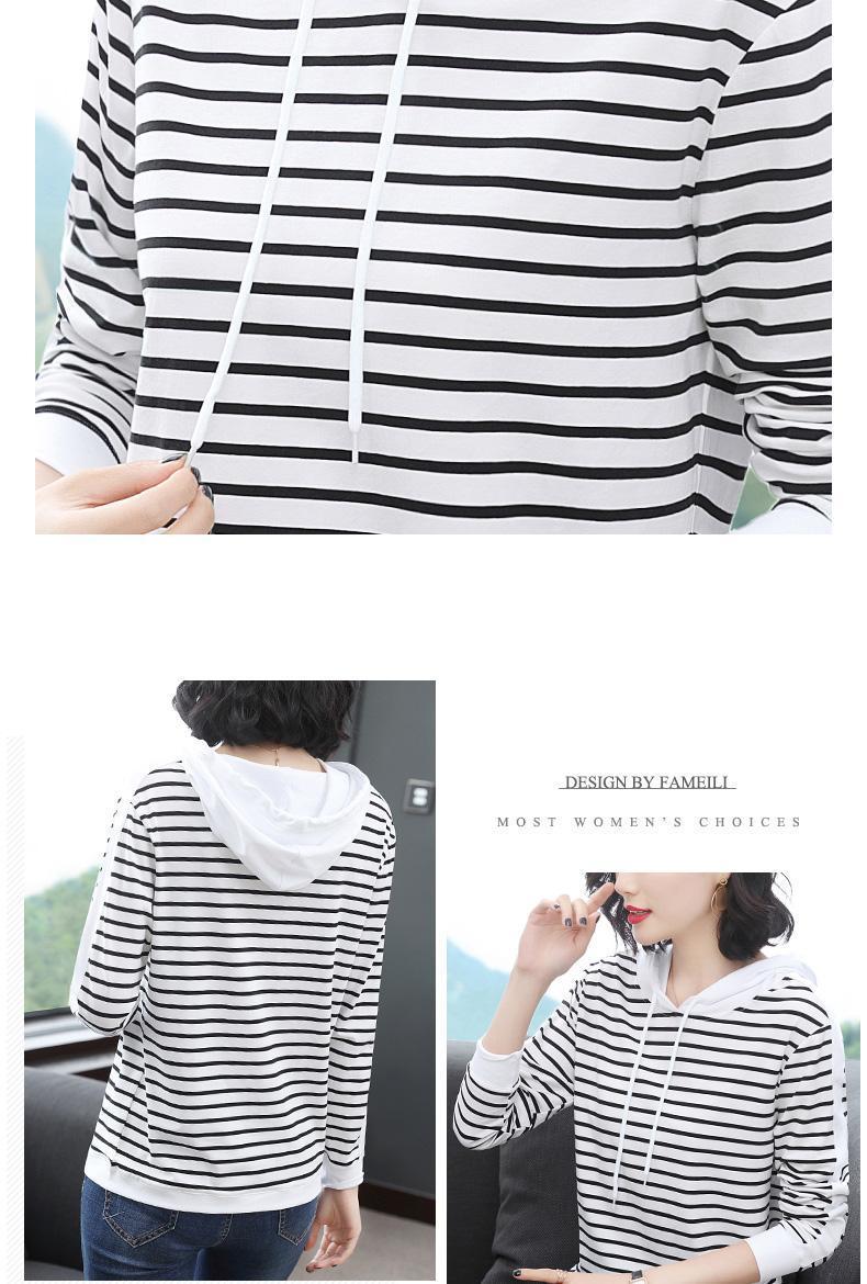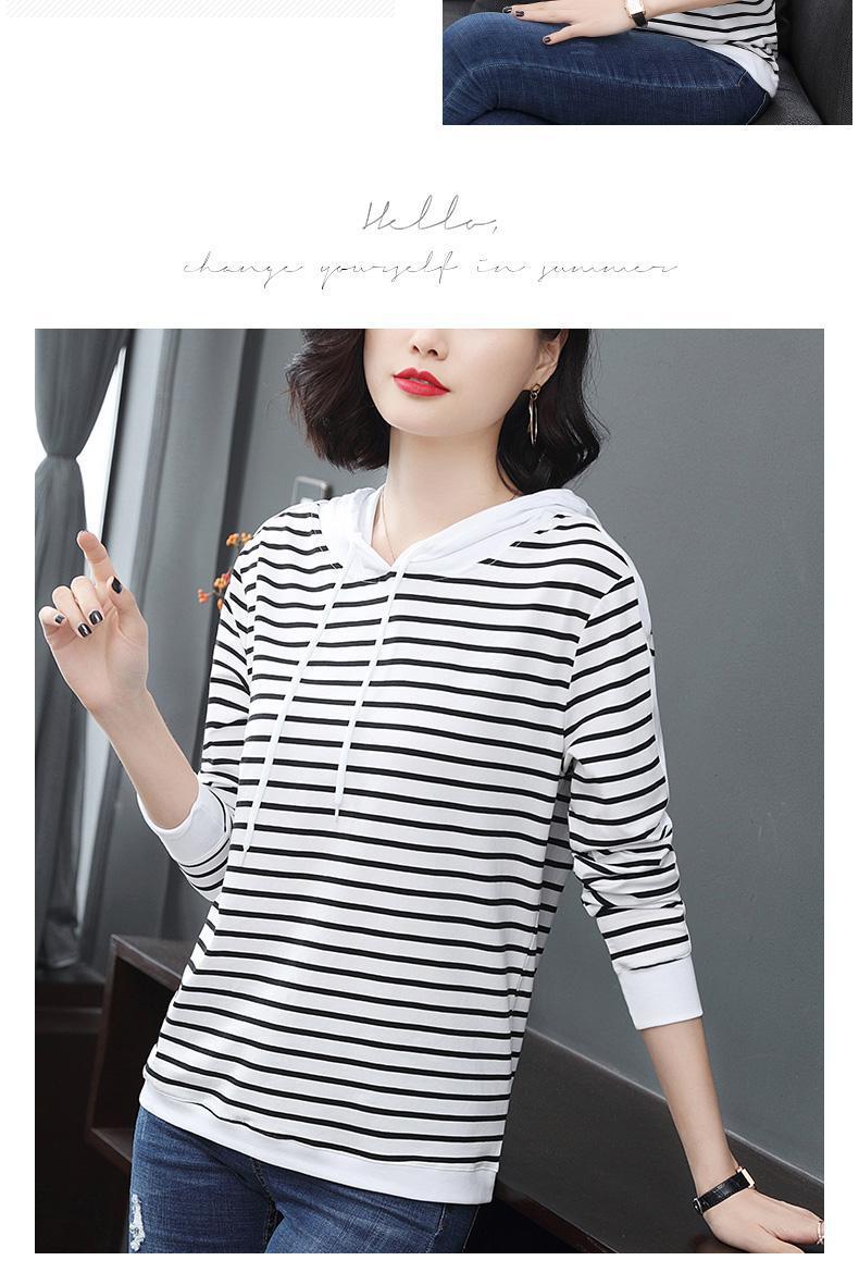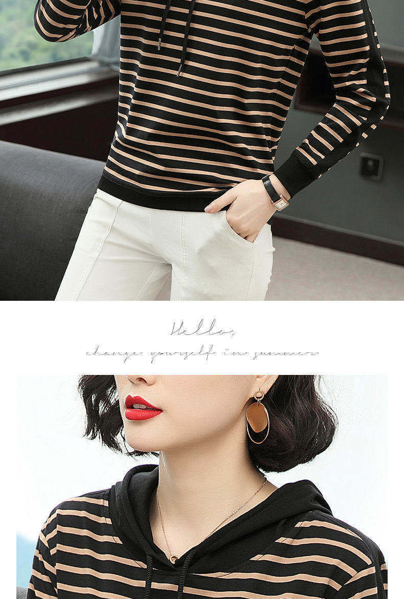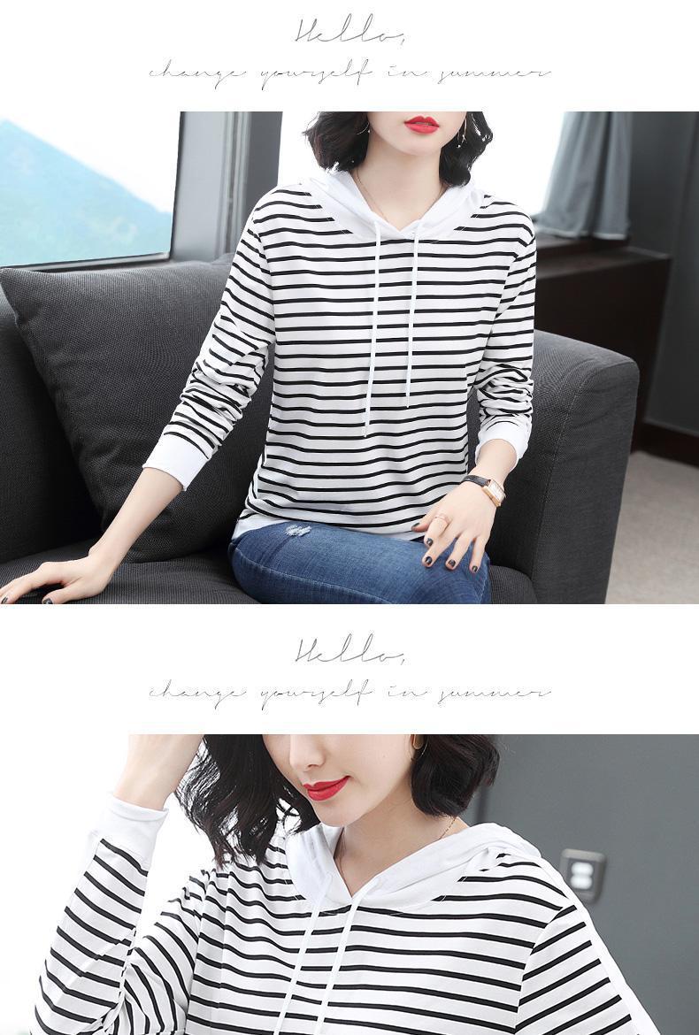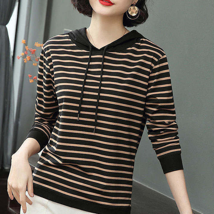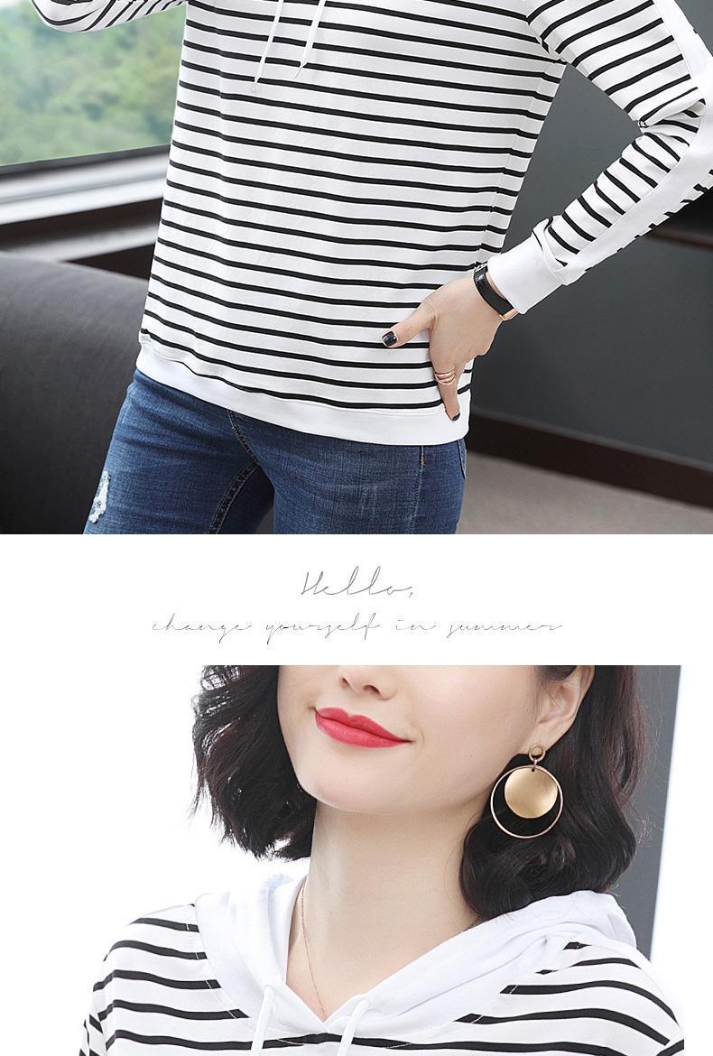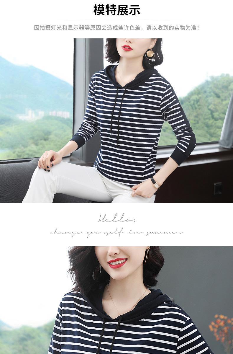 2022 봄과 가을 새로운 스트라이프 티셔츠 여성의 중년 어머니 느슨한 스트라이프 후드 긴팔 플러스 사이즈 여성 상의스토어 가기
