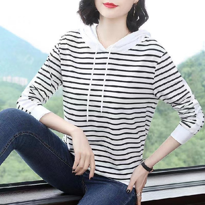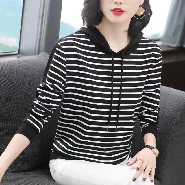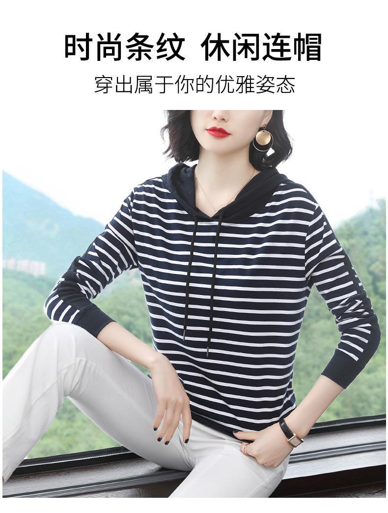 2022 봄과 가을 새로운 스트라이프 티셔츠 여성의 중년 어머니 느슨한 스트라이프 후드 긴팔 플러스 사이즈 여성 상의