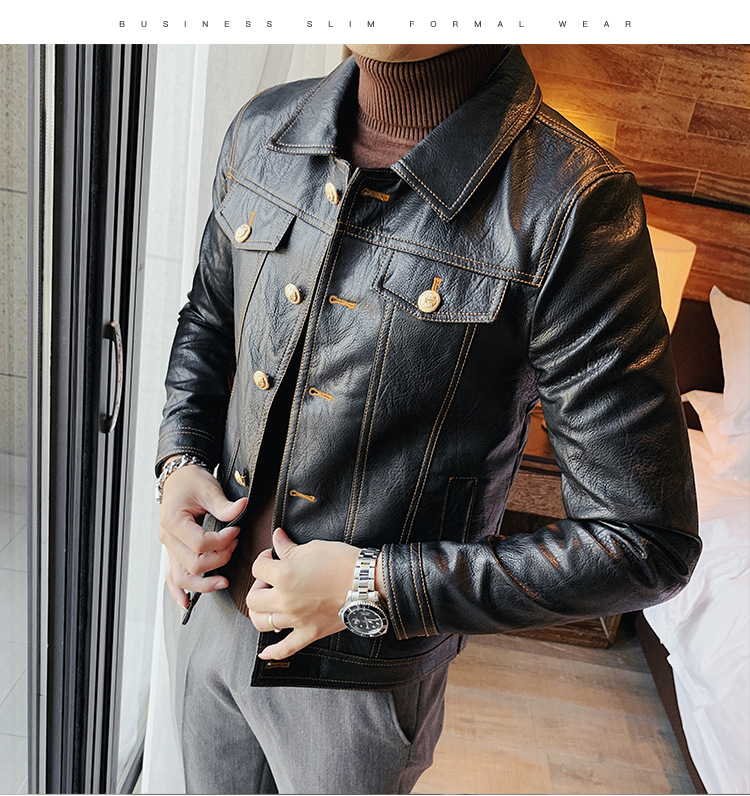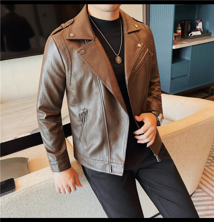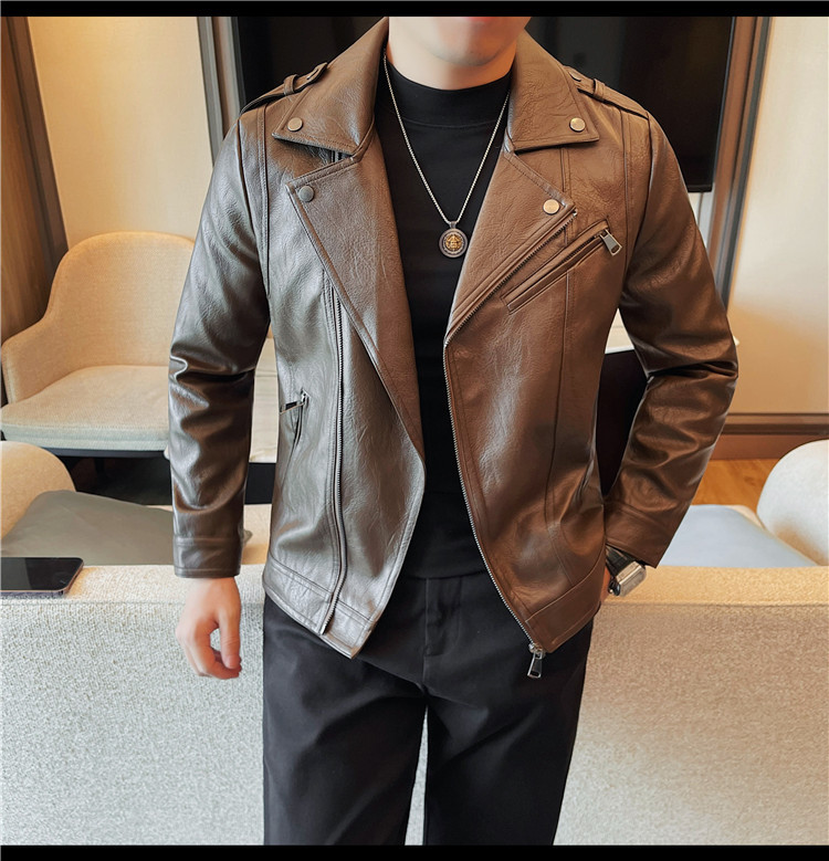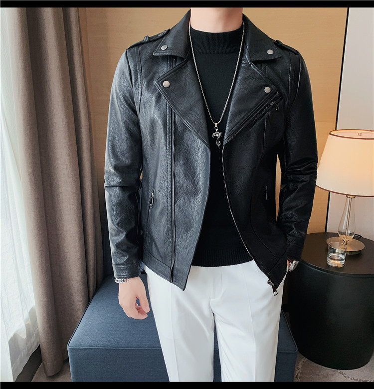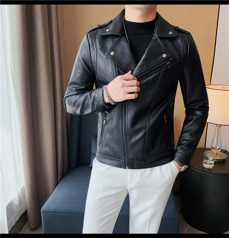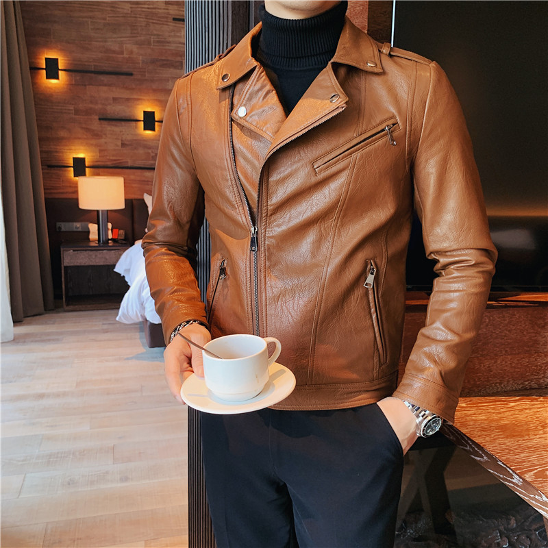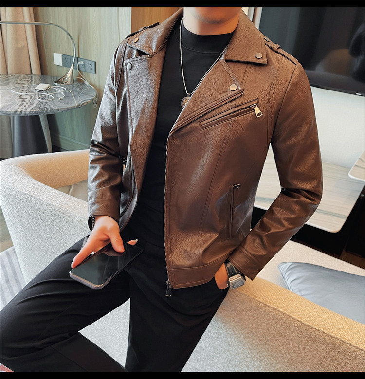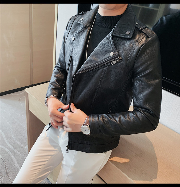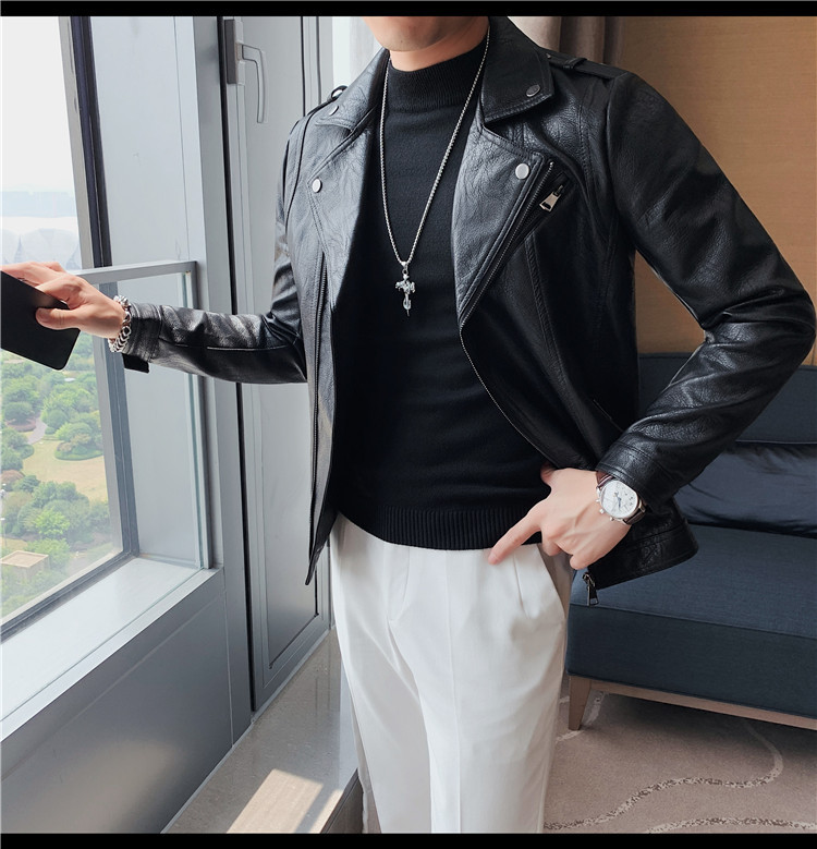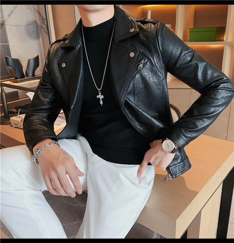 크로스 보더 가죽 남성 가을과 겨울 Ruffian 잘 생긴 외국 오토바이 재킷 코트 소형 버전 슬림핏 브레스트 PU 가죽 남성 의류스토어 가기