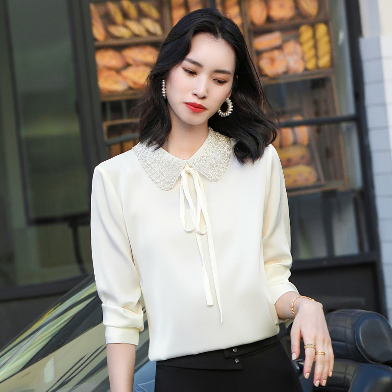 흰색 쉬폰 셔츠 여성의 패션 세련된 프랑스 스타일 시크 탑 한국어 느슨한 봄과 가을 인형 칼라 긴 소매 셔츠스토어 가기