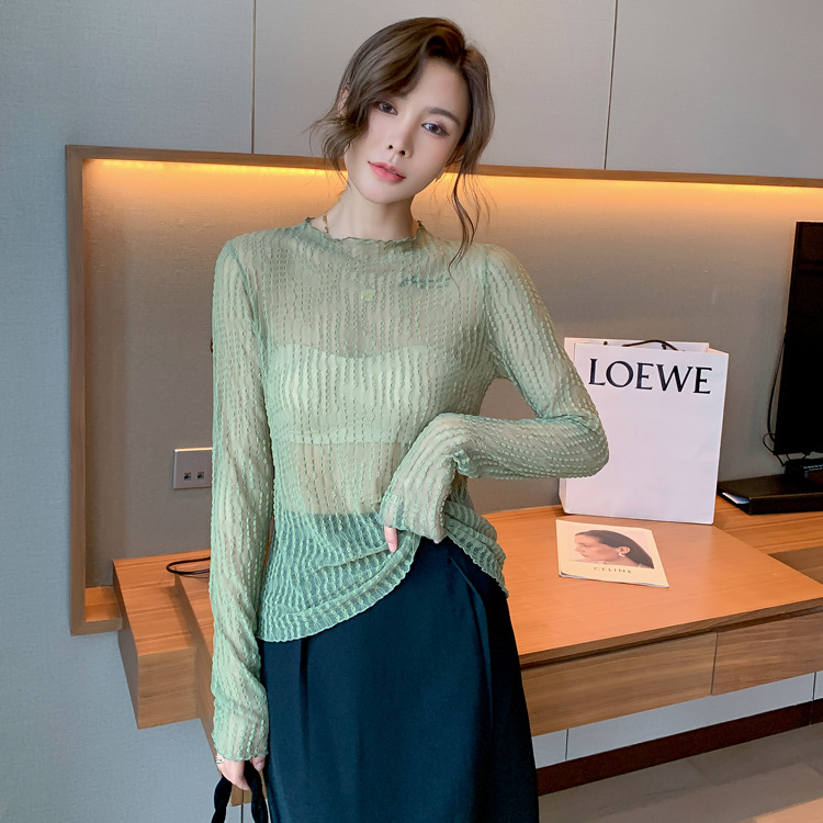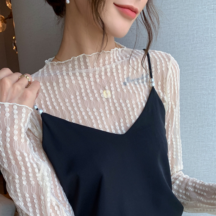 하프 하이 칼라 블랙 레이스 베이스 셔츠 여성용 긴팔 내부 용기 2021 새로운 스타일 웨스턴 스타일 웨이브 도트 메쉬 탑스토어 가기