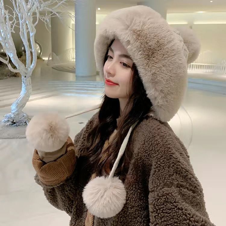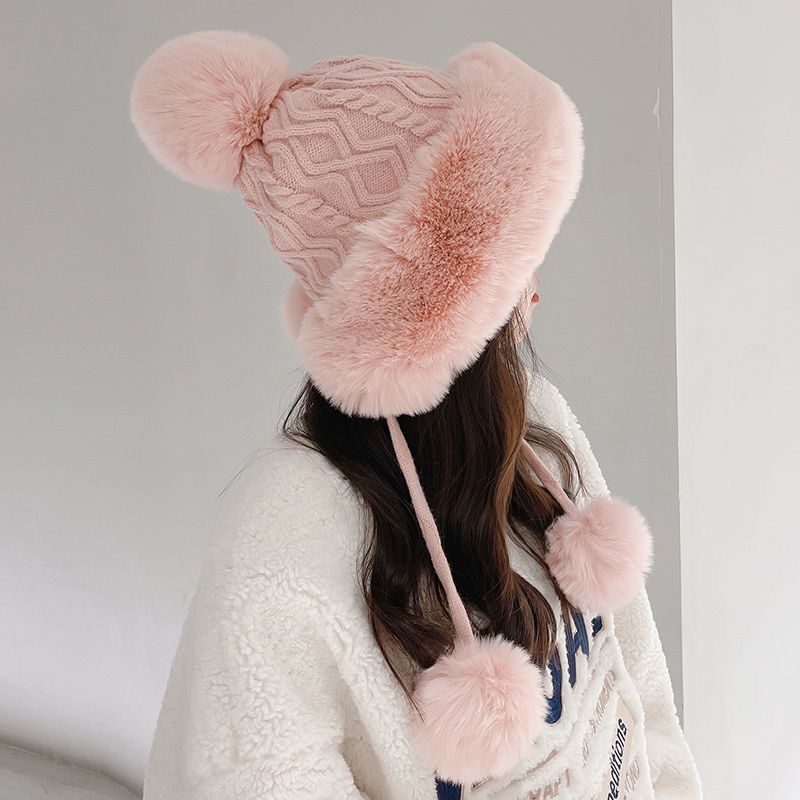 가을과 겨울 새로운 모조 토끼 모피 레이 펑 모자 니트 기모 울 모자 달콤한 귀여운 귀 따뜻한 여자의 모자스토어 가기