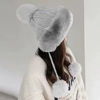 가을과 겨울 새로운 모조 토끼 모피 레이 펑 모자 니트 기모 울 모자 달콤한 귀여운 귀 따뜻한 여자의 모자